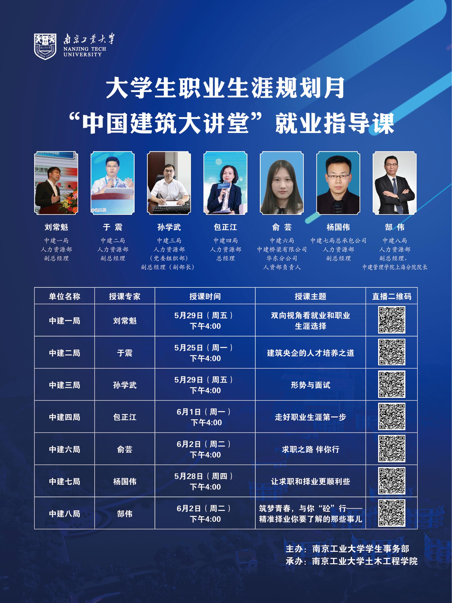 今年全国两会中提出高校要提供不断线的就业服务,“中国建筑大讲堂”是白菜官网直面疫情影响下的就业形势的积极举措之一,后续还将有七场由中建各工程局人力资源专家主讲的高质量讲座陆续推出,继续为在校大学生从理论和实战多角度提供优质就业解读和指导服务,帮助学生了解土建行业的发展趋势,更好地为学生提供高端就业指导服务。