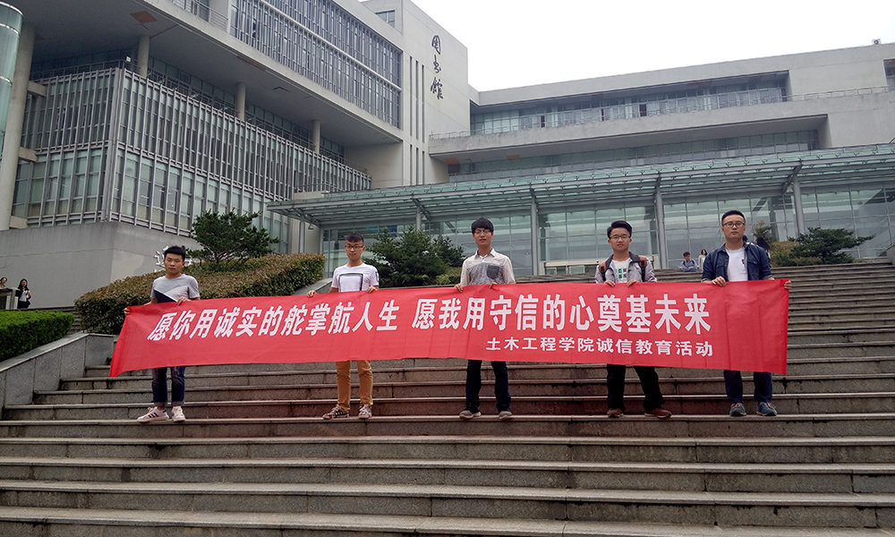 2016年6月12日,土木学院义工服务小组的同学开展了诚信教育主题活动,活动主题是“愿你用诚实的舵掌航人生,愿我用守信的心奠基未来”,小组同学在校图书馆,厚学楼,东苑食堂等人流量较大地区拉起了横幅,号召同学们在横幅上签名并在便签上写下自己对诚信的理解,参加活动的同学纷纷表示此项活动意义非凡,参与度非常高。不仅同学们参与到我们的活动中来,更有老师在便签上写下了对同学们的寄语,号召同学们用诚实和守信来考出好成绩。