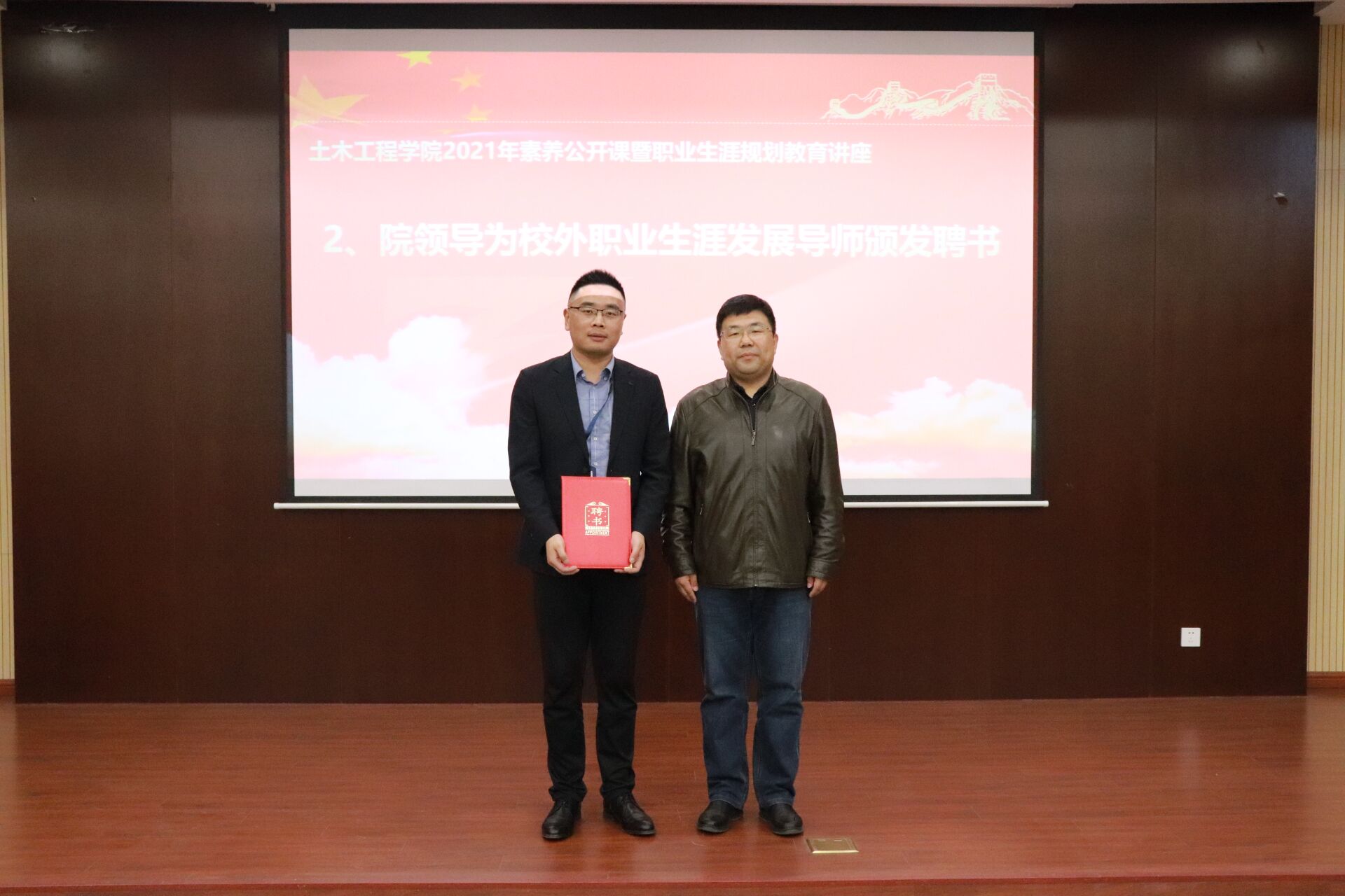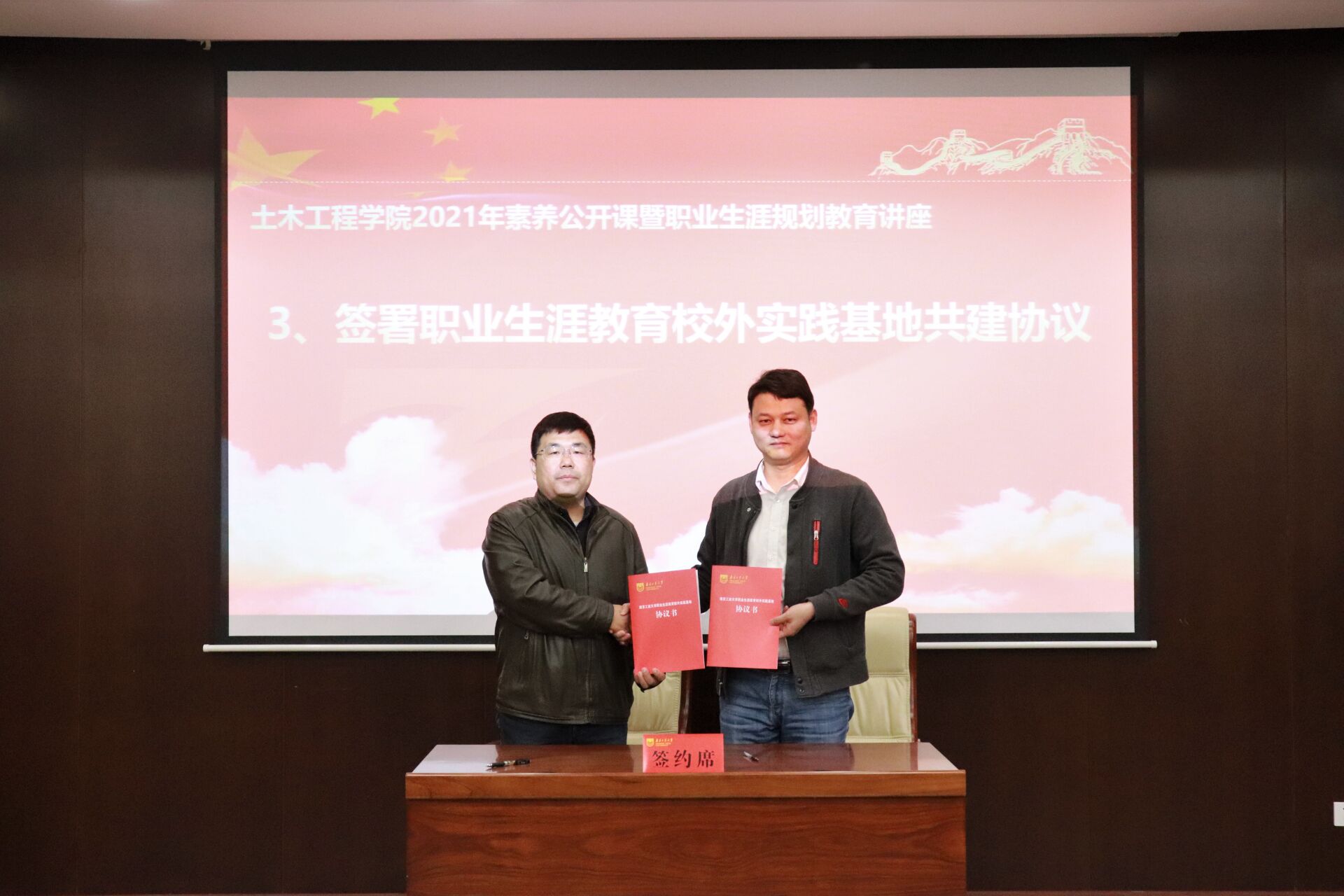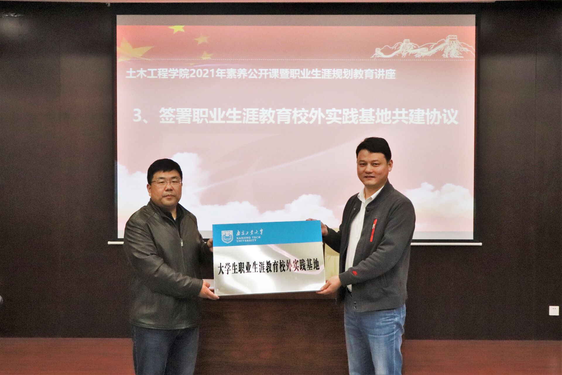 在热烈的掌声中,院党委书记张涛为李盛经理颁发校外职业生涯规划导师聘书,与上海宝冶南京分公司庄道春部长共同签署职业生涯教育校外实践基地共建协议并授牌。