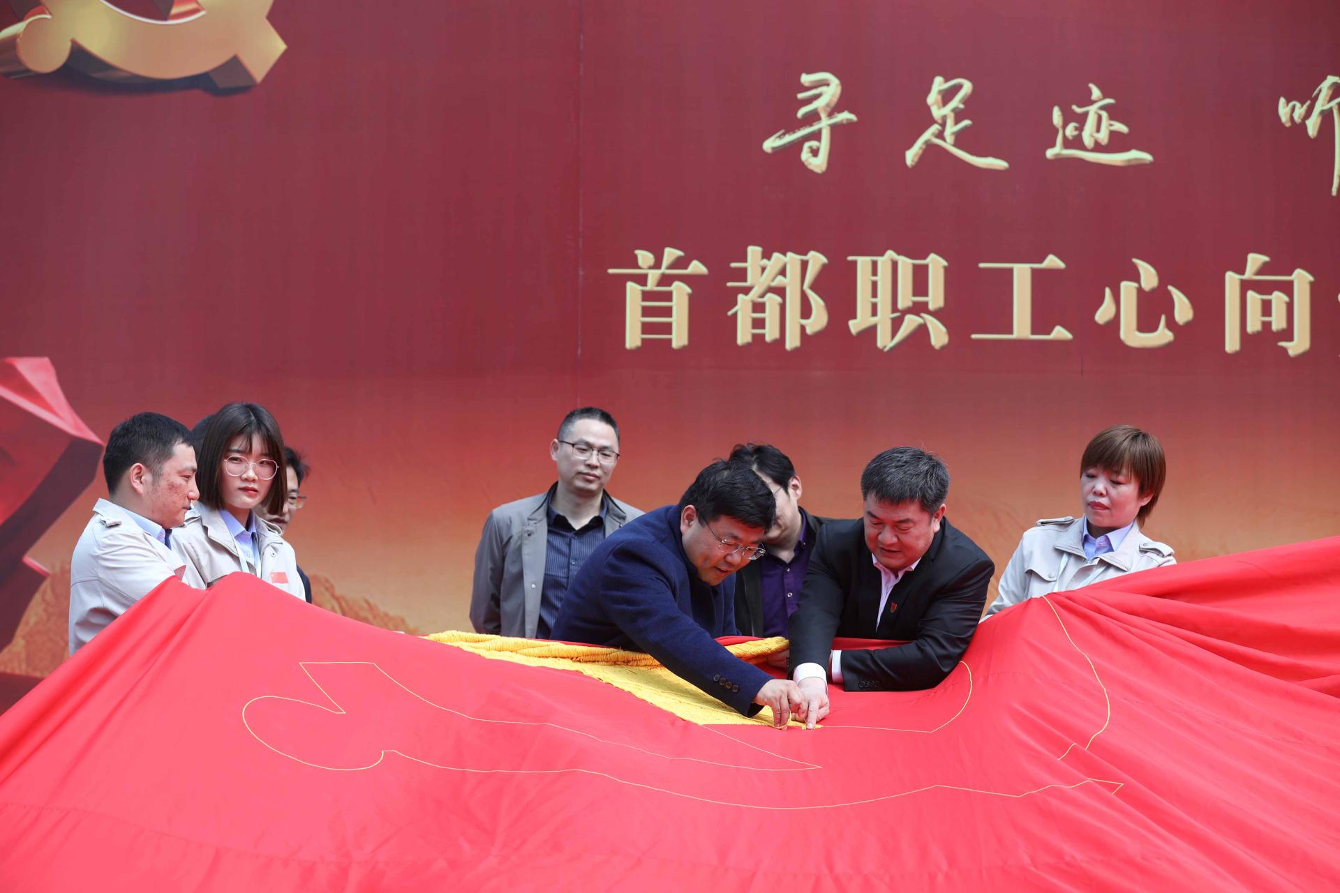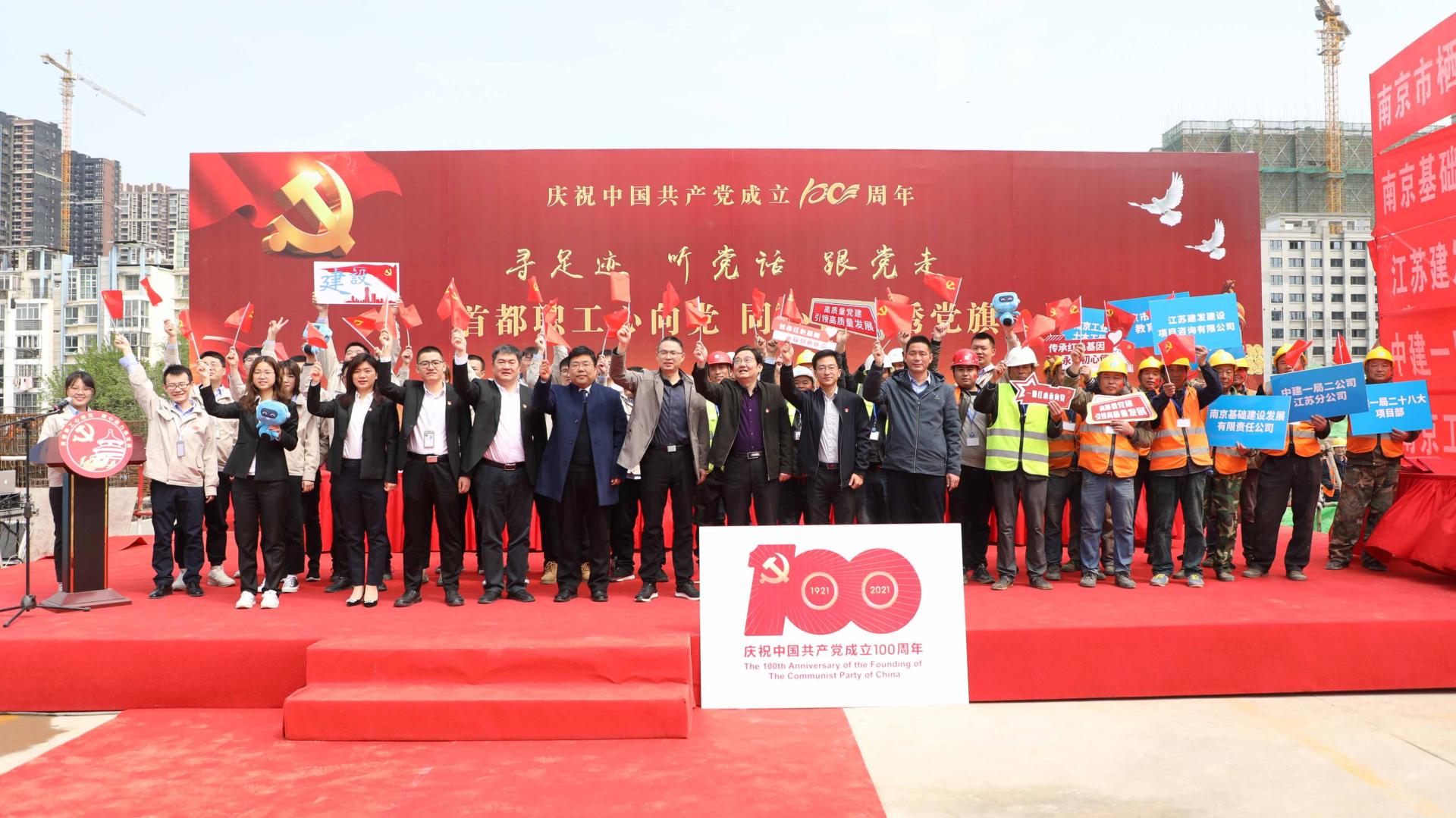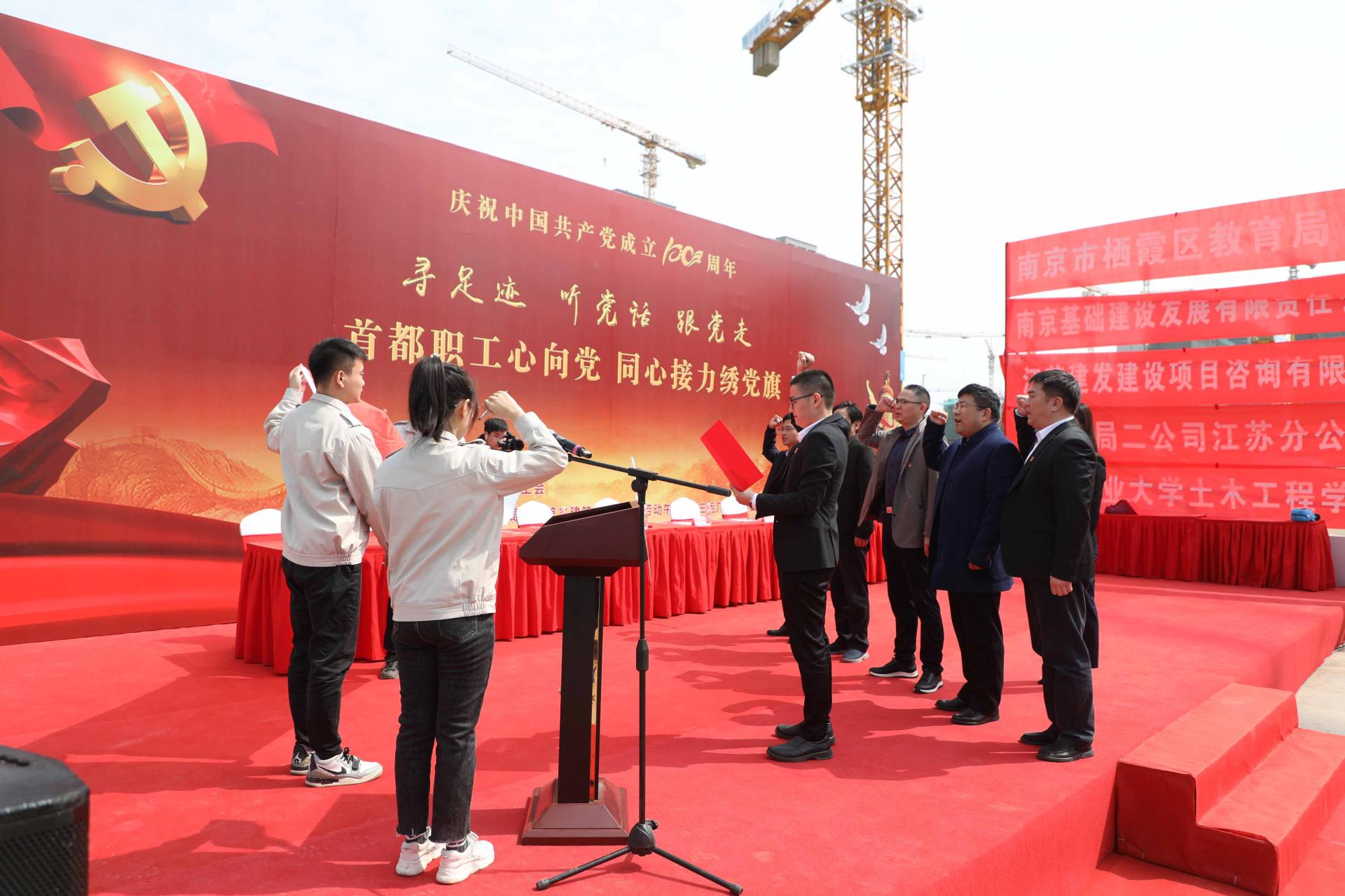 首先,党员师生代表一行抵达中建一局二公司南京数码港项目,在会议室聆听了公司及项目的情况介绍,充分了解了企业发展的文化与历史。随后前往项目工地现场参观,与身处工作岗位的党员进行深入交流,相互学习,加深对项目工程先进做法的了解。最后前往三毛厂项目部参加绣党旗仪式,与公司领导一同重温入党誓词、深情吟唱红歌并接力绣党旗。
