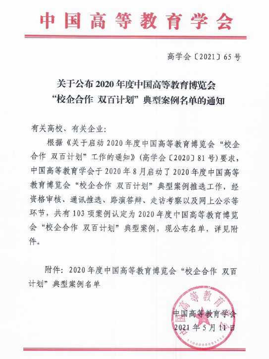 中国高等教育学会于2019年首次发起“双百计划”,旨在为高校和企业搭建合作桥梁,构建对话交流平台,推广创新产教融合、校企合作模式,交流、深化和复制成功经验,并在高博会上进行集中展示,形成示范带动作用。2020年度“双百计划”典型案例推选活动自去年8月启动以来,共收到285家单位申报的670项案例,经过资格审查,通讯推选、路演推演、双走访等环节,共有103项案例被认定为2020年度中国高等教育博览会“校企合作双百计划”典型案例。