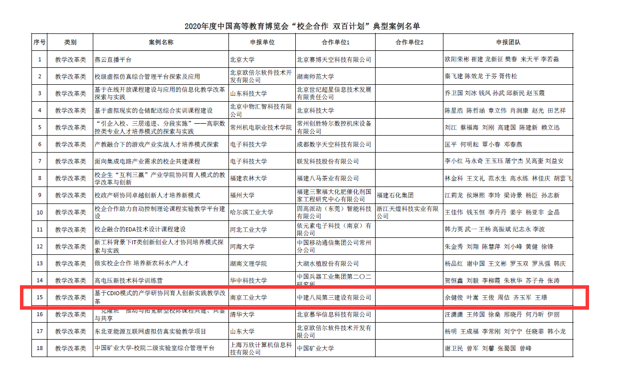 近日,中国高等教育学会公布了2020年度中国高等教育博览会“校企合作 双百计划”典型案例名单,999论坛白菜大全佘健俊、王俊、周佶、齐玉军四位老师共同申报的“基于CDIO模式的产学研协同育人创新实践教学改革”成功入选。