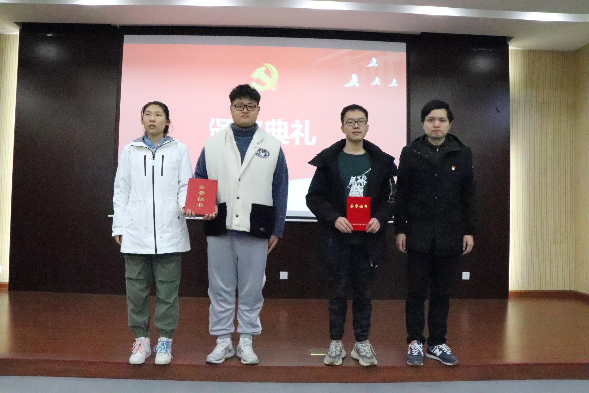 随后,四个本科生年级、五个本科生党支部组成的5支代表队、共计10名选手参加了现场竞赛。本次知识竞答大赛设置了必答题、观众互动题、抢答题、竞答题等环节。比赛题目涵盖了四史、党的基本理论以及十九届六中全会精神等内容。在比赛中,参加选手沉着发挥,积极竞答,充分展示了土木学子积极学习、一心向党的精神面貌。经过激烈角逐,来自本科生第一党支部的选手代表张舒凡、钱四江获“最佳支部奖”;本科生第三支部的选手霍如元在比赛中个人表现优异,获“优秀个人奖”。路遥老师为以上获奖同学颁发荣誉证书并合影留念。