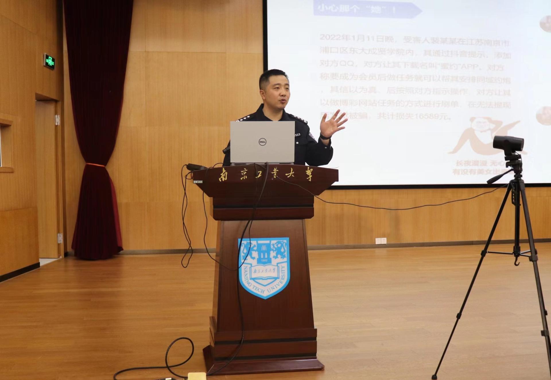 为进一步提高学院学生防诈反诈意识,进一步提升反诈宣传员业务技能,3月16日下午,由保卫处主办、999论坛白菜大全承办的“防范电信网络诈骗”安全教育专题讲座在笃学楼报告厅开展。江北新区公安分局刑警支队政委、南京市侦查标兵、江苏省百佳刑警马科同志担任主讲人。本次讲座采用线上下结合的方式,学院本科生、研究生反诈宣传员、学生代表等近40人现场参加,其他学生线上同步观看。讲座由保卫处副处长徐东主持,院党委副书记路遥、学生工作办公室主任黄乐等参加活动。
