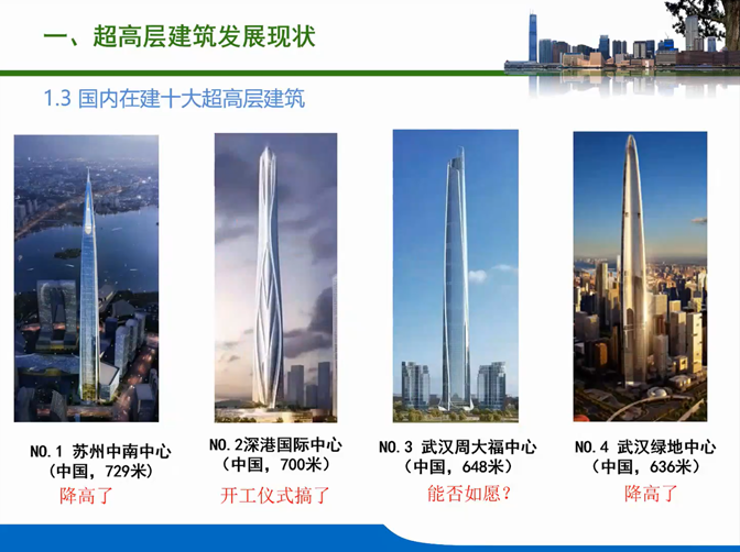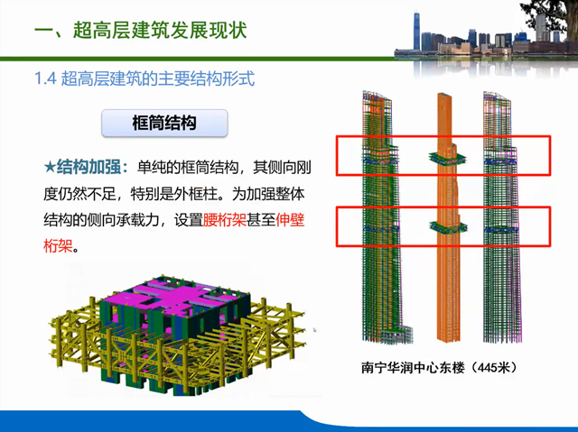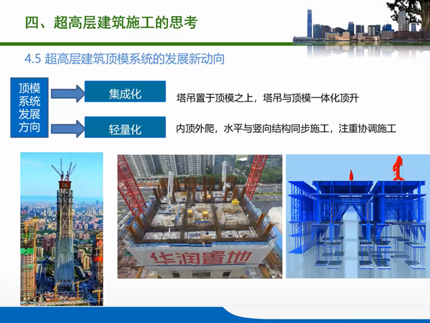 在此次讲座中,唐际宇高工主要介绍了超高层建筑的发展现状、施工特点及重难点、以及施工关键技术等方面内容,特别是结合南宁华润中心写字楼超高层建筑施工项目,从大体积混凝土施工、超高层核心筒模架、垂直运输设备的选择与布置、钢结构的安装、BIM技术在超高建筑中的应用等方面做了详细的介绍,并通过动画展示相关施工技术。最后,唐际宇高工从10个方面给出了自己在超高层建筑施工方面的思考和见解。