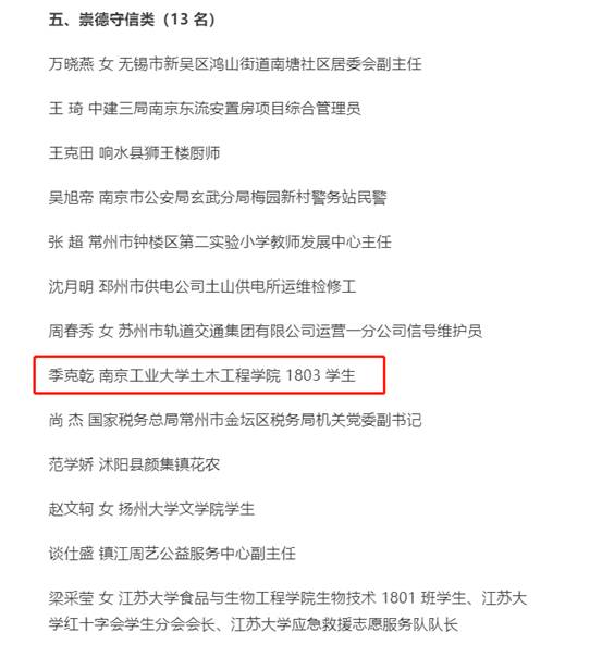 在五四青年节即将到来之际,由共青团江苏省委、江苏省文明办、江苏省通信管理局、江苏省青年联合会等单位联合主办的2021年“江苏好青年”百人榜名单出炉。在社会推荐、资格审查、网络展示和专家评审的基础上,经组委会研究,最终产生了包括疫情防控、爱岗敬业、创新创业、勤学上进、崇德守信、乡村振兴等6个类别的2021年“江苏好青年”百人名单。我院土木1803班季克乾同学成功入选榜单中的“崇德守信”好青年,成为百人榜名单中仅有的四名本科生之一。