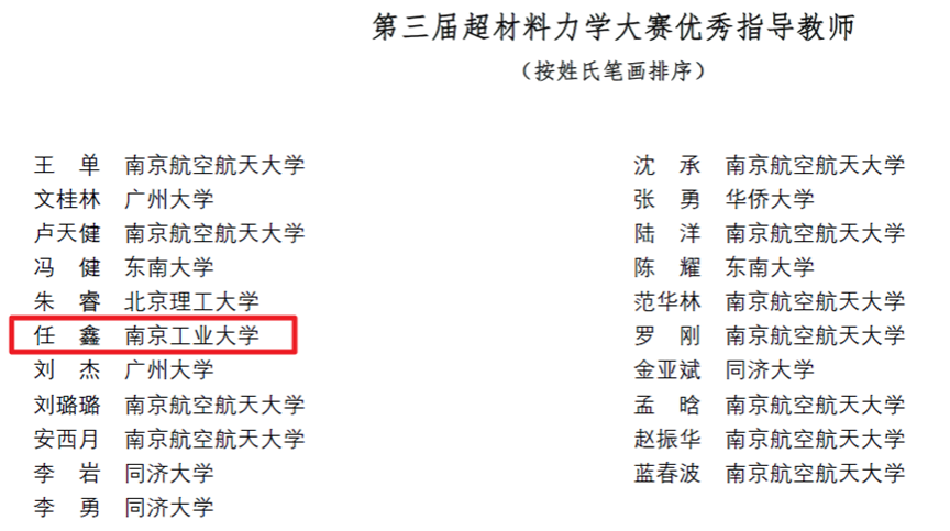 第三届超材料力学大赛由江苏省力学学会、江苏省航空航天学会、中国力学学会固体力学专委会波动力学专业组主办,南京航空航天大学航空学院承办,南京市科学与技术协会指导。本次进入决赛的队伍共计34组,参赛单位包括北京理工大学、西北工业大学、同济大学、东南大学、哈尔滨工业大学、南京航空航天大学等多所高校。经专家初审、决赛路演等环节,我院研究生郝建、滕星池、郎建萍的作品“一种方型截面的负泊松比管状晶格超材料”和张学刚、蒋慰、倪希海的作品“具有高韧性的三维负泊松比超材料”荣获二等奖;程贤、罗钰茗、许航航的作品“轻量化负泊松比超材料:设计和力学性能研究”荣获三等奖。同时,任鑫教授获评此次超材料力学大赛优秀指导教师。