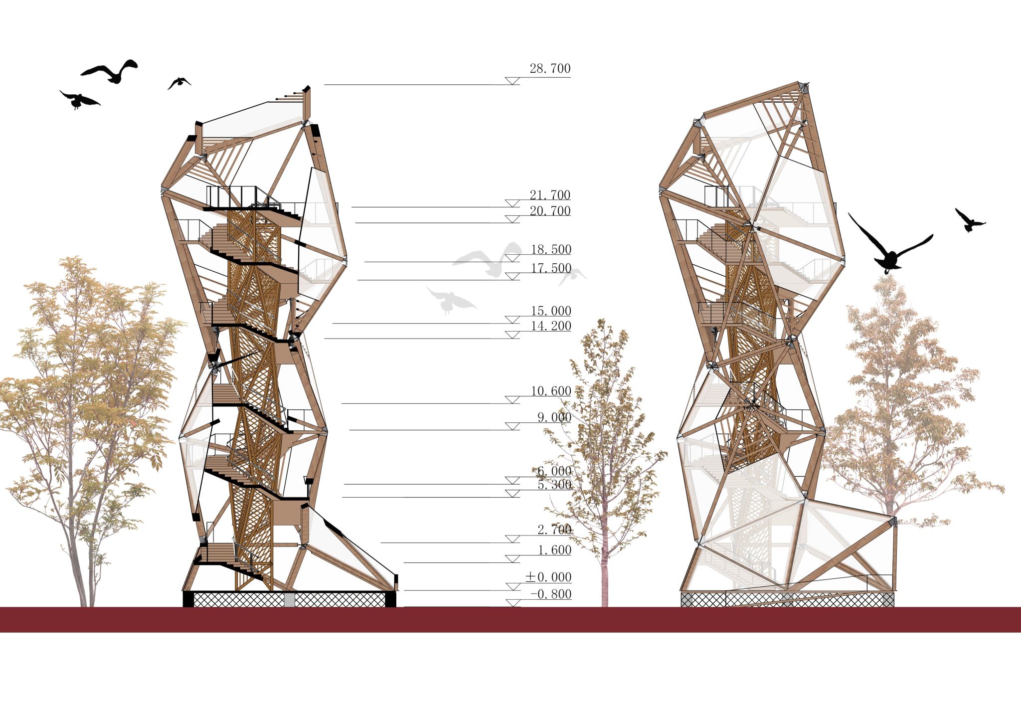 本次竞赛由同济大学、教育部高等学校土木工程专业教学指导分委员会主办。本次赛题为湿地公园景观塔,共有同济大学、东南大学、哈尔滨工业大学、东北林业大学、南京林业大学等15所高校的22件作品参赛。通过初评,我院孙小鸾老师联合999策略白菜手机论坛建筑学院张海燕老师指导的设计作品“鱼·跃”作为8组优秀作品之一入围决赛,并在众多优秀作品中脱颖而出,以灵动活泼的仿生造型、严谨合理的结构设计以及出色的答辩表现得到评委的一致好评,最终以总分第一名的优异成绩荣获一等奖。