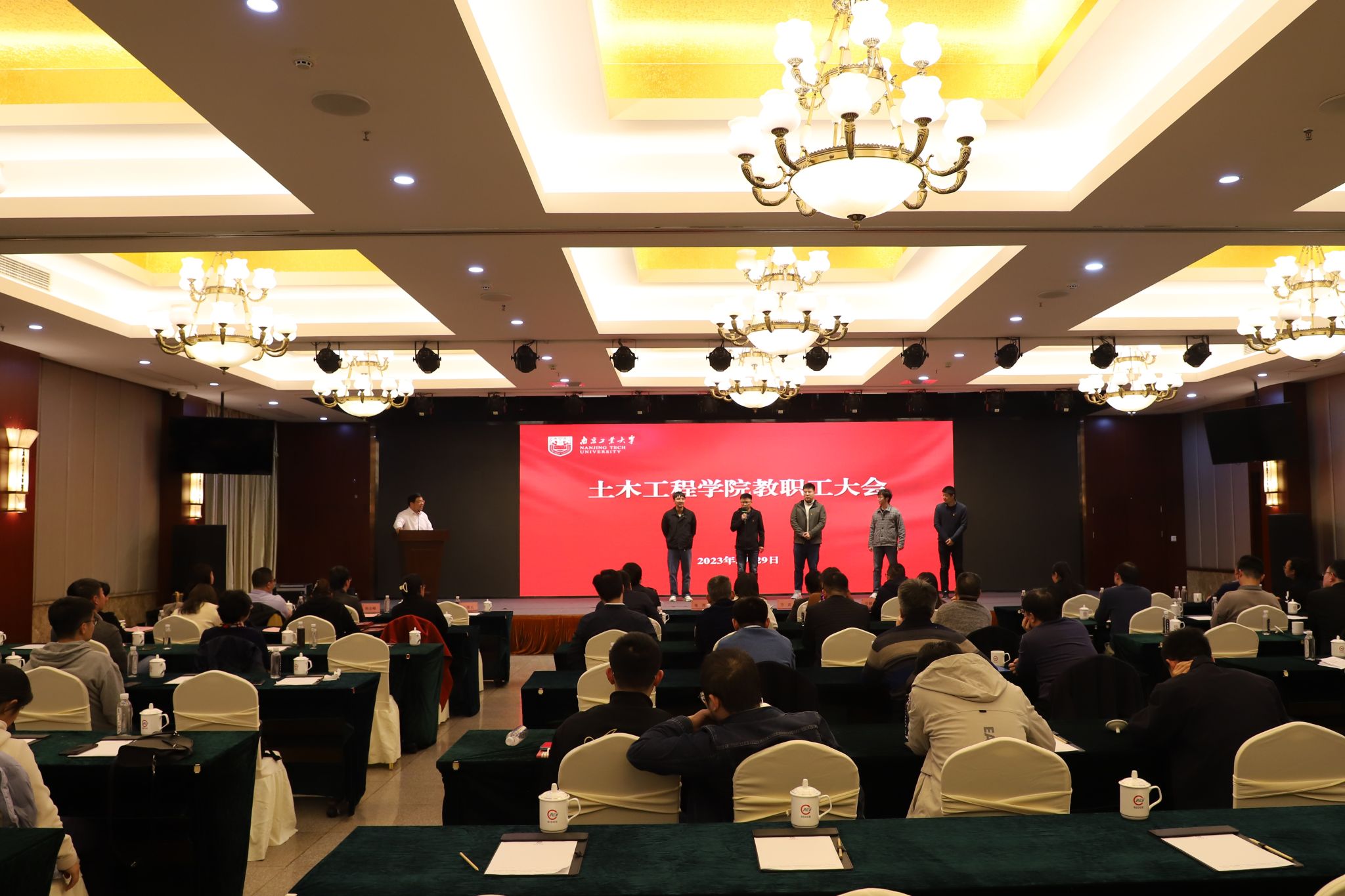 参观结束后,学院于南钢宾馆会议室召开全院教职工大会,会议由院党委书记张涛主持。会上,全体教师集体观看了南钢企业宣传片,听取南钢集团特钢营销处毛乃旭处长介绍集团产品和研发方向,并集中观看党风廉政建设专题教育片《党史中的清廉故事》。学院还邀请南京市公安局交通警察支队第五大队蒋磊教导员、校保卫处徐东副处长及科研院产学研合作科卢奇老师,先后以“远离酒驾,平安回家”、“教工防电诈”、“横向科研办理要点”为主题进行了专题宣讲和细致解读。会上,近期新入职学院的5位青年教师还介绍了各自的研究领域。
