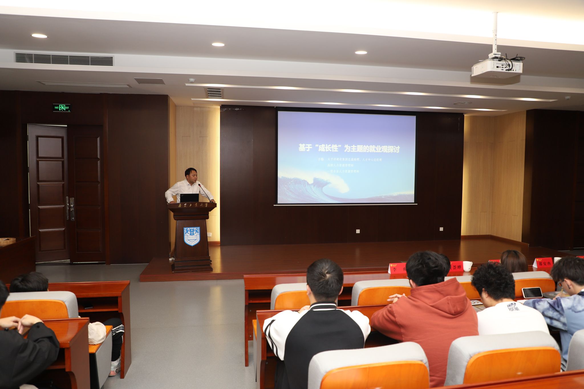 于伟先生以《基于“成长性”为主题的就业观探讨》为题,结合自己丰富的大型企业人力资源管理工作经历,从当前就就业的背景环境入手,分别通过毕业生和用人单位的视角,结合“加速度”理论、冰山模型、优秀毕业生“画像”等与同学们深入浅出地探讨了如何树立正确就业观。于伟先生结合太平洋建设集团的人才成长路径,为同学们及早做好职业规划和就业准备提出了具体指导。