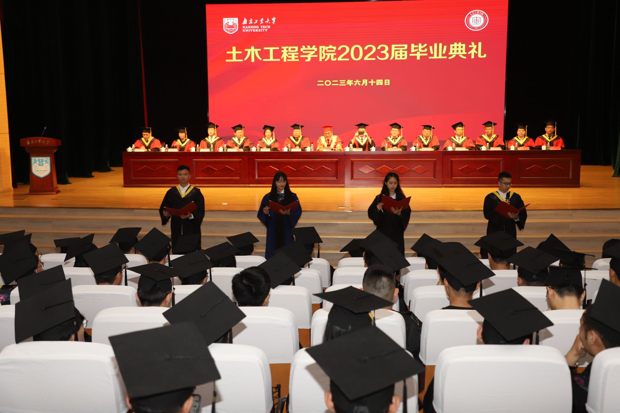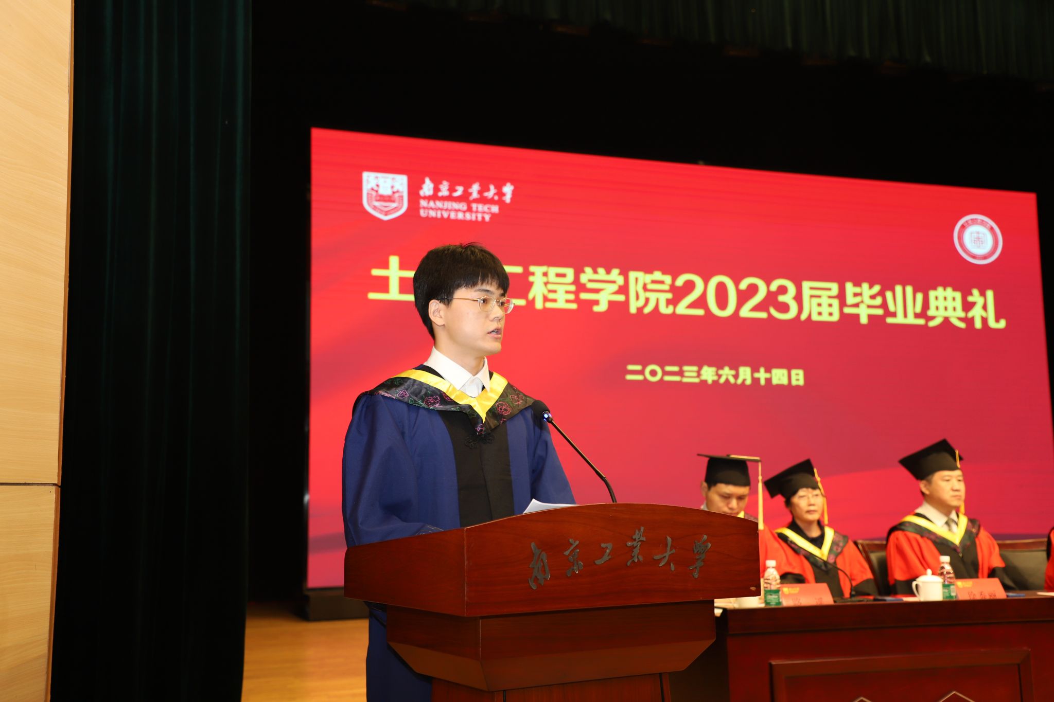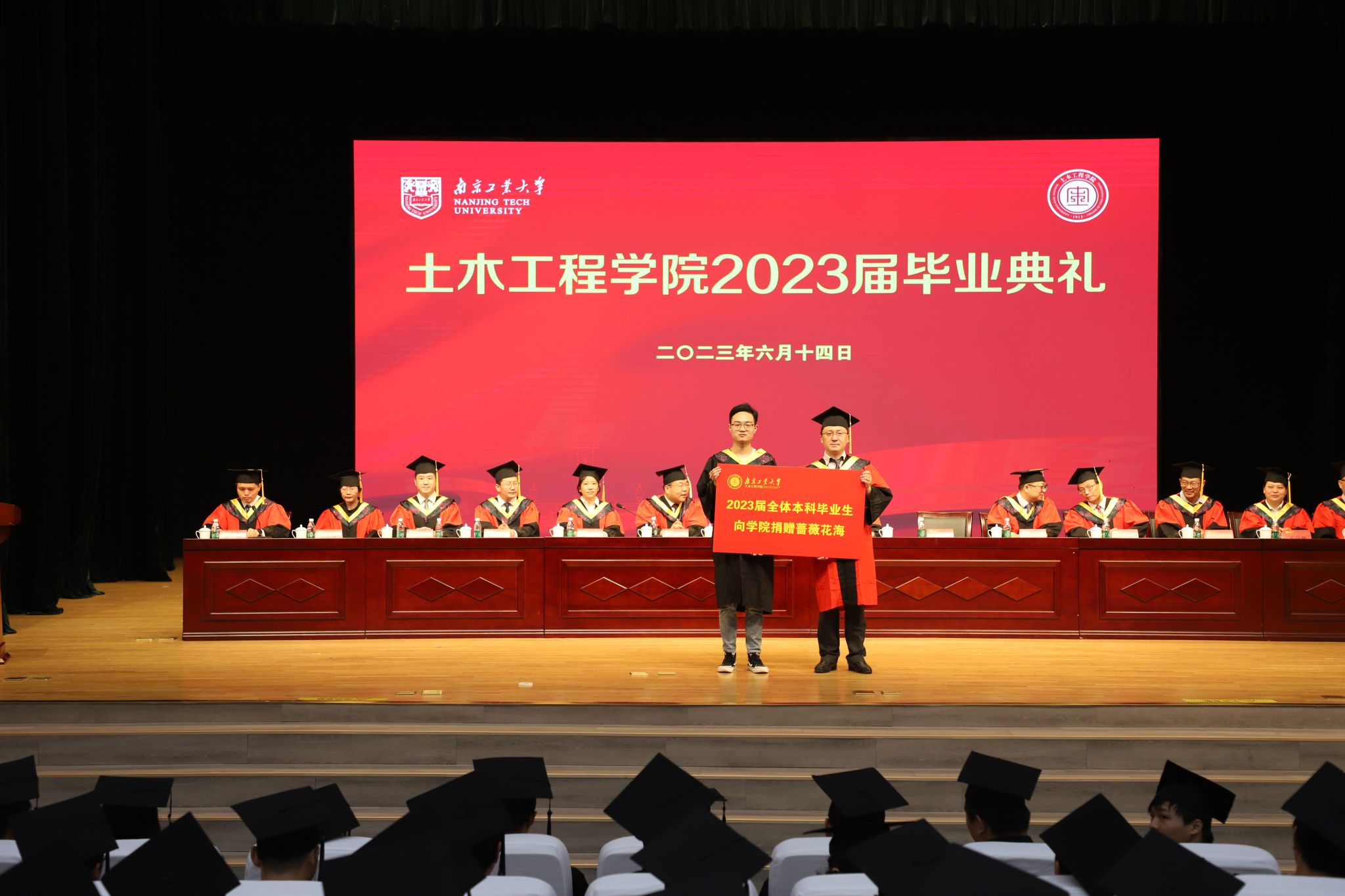 毕业典礼伊始,全场奏唱国歌。院党委书记张涛宣读校优秀毕业生名单;院长方海宣读“中铁建工”就业工作专项奖学金表彰决定;本科毕业生代表土木1903班王开睿同学、毕业研究生代表土研2002蒋慰同学分别发言,分享了自己在校期间的学习生活感悟,感谢学校、学院和师长的谆谆教诲。家长代表、土木1903班谭梦辰同学父亲谭昌龙发言,表达了对母校辛勤培养学生的感谢。教师代表任鑫教授在发言中表示,希望同学们牢记校训,通过终身学习提高人才竞争力。随后,学院向2023届毕业生代表赠送纪念戒指,2023届毕业生代表向学院捐赠蔷薇花海,毕业生代表朗诵《到祖国最需要的地方去》。在欢快的音乐声中,在主席台就坐的师长们为毕业生代表授予学位并拨穗。
