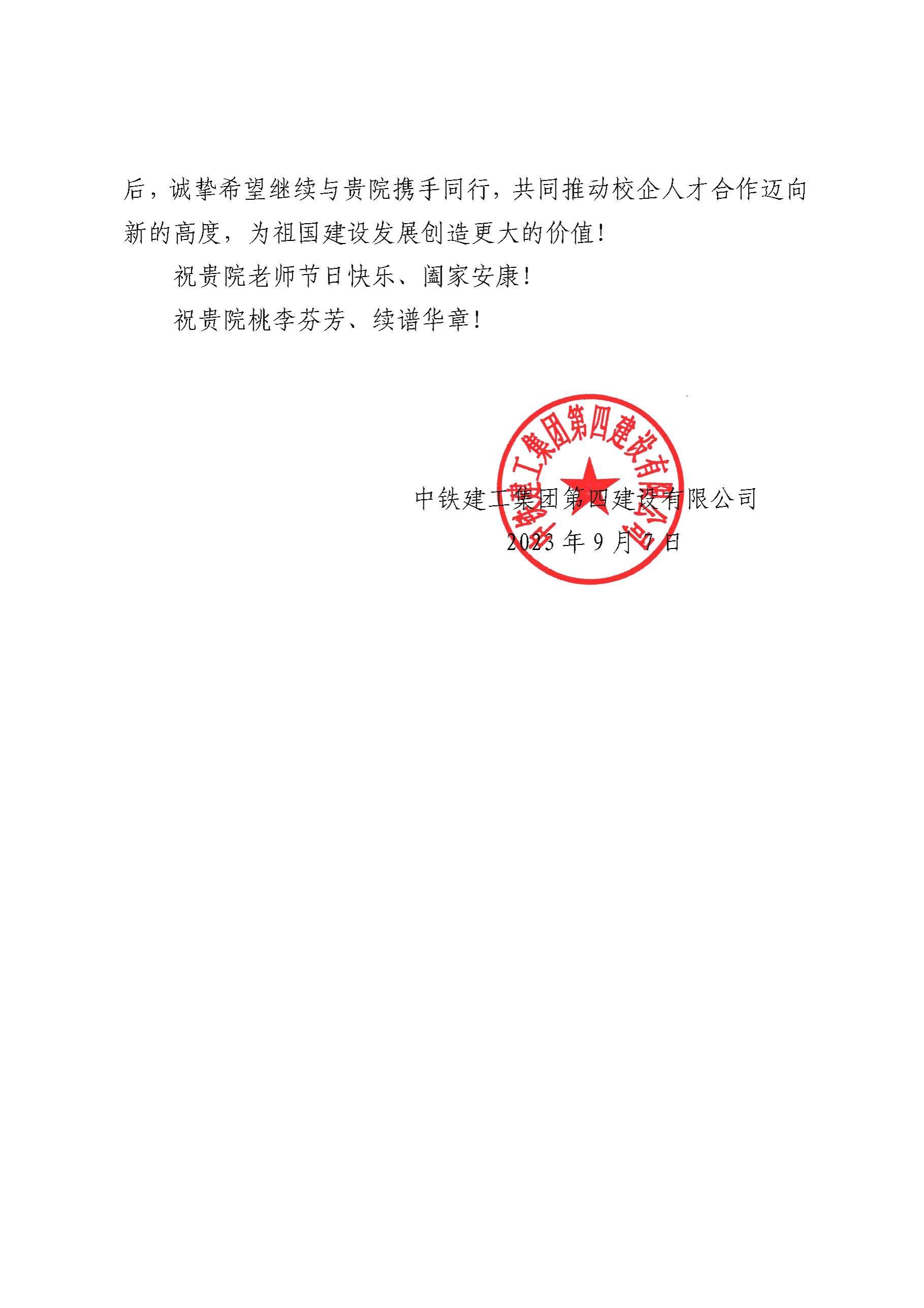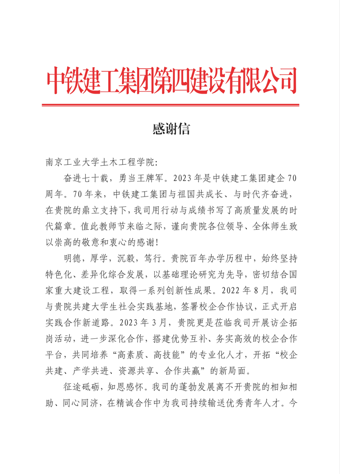 中铁建工四公司给我院发来感谢信