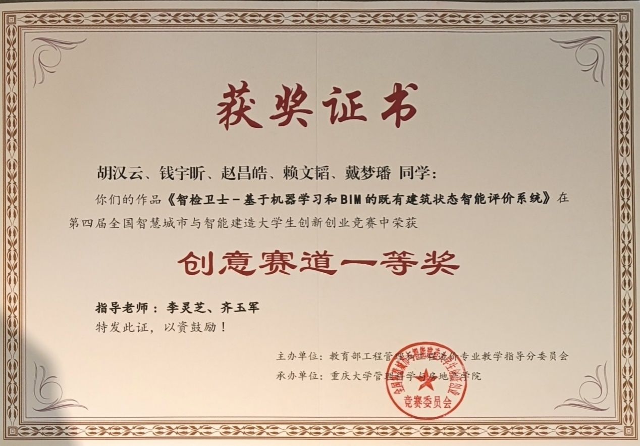 近日,由教育部工程管理和工程造价专业教学指导分委员会主办的第四届全国智慧城市与智能建造大学生创新创业竞赛决赛在重庆大学成功落下帷幕。999策略白菜手机论坛代表队由999论坛白菜大全胡汉云、赵昌皓、赖文韬、戴梦璠和计算机与信息工程学院(人工智能学院)钱宇昕五位同学组成,在李灵芝、齐玉军老师的指导和学院的关心支持下,历经近120天的艰苦备赛,开发出“智检卫士”—基于机器学习与BIM的既有建筑安全状态智能评价与预警管理系统,将为全面推进的老旧住房安全排查与城市体检工作提供高效平台。在现场决赛中,该团队与来自多所知名985重点高校的队伍展开激烈比拼,最终荣获第四届全国智慧城市与智能建造大学生创新创业竞赛一等奖。