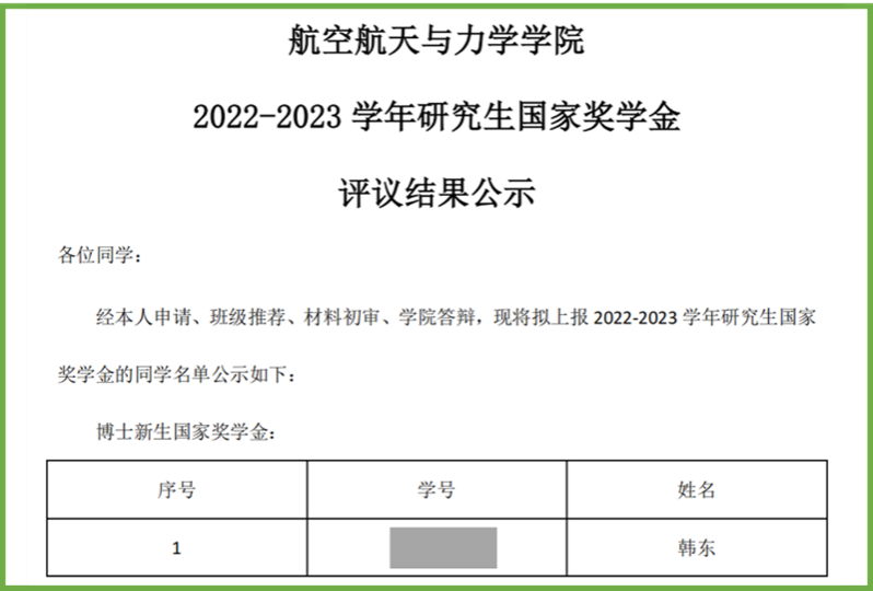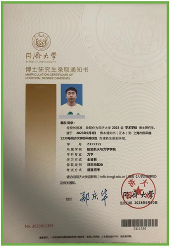 我院2023届优秀研究生校友韩东获同济大学博士新生国家奖学金