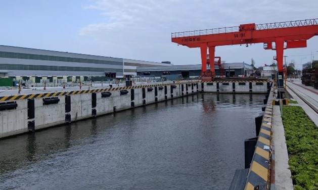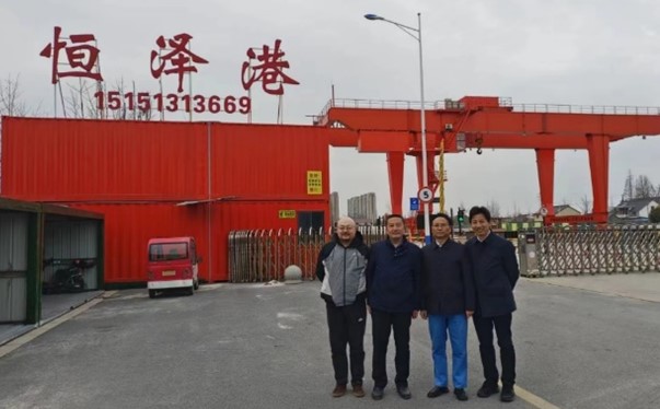 王忠泽董事长首先陪同参观了刚刚建成使用的恒泽港和海安交通局设在恒泽港的恒泽先锋憩息港,重点介绍了历时十余年建成的恒泽港。恒泽港位于南通内河港海安港区连申线航道东岸,海安高新区老仁桥大桥北侧,新仁桥大桥南侧东岸约180m处。紧邻恒泽集团钢结构生产基地,年通过能力40万吨,陆域面积14000 m²,水域面积6300m²。港池为挖入式泊位,水深4.5m左右,可停靠千吨级船舶。港口设有一台50T-22M双梁门式起重机、一台移动式SMHC70抓钢机。随着恒泽港的建成使用,恒泽建设集团承担大型钢构件加工的业务快速增加,效益稳步提高,标志着恒泽集团的发展进入了新时代。