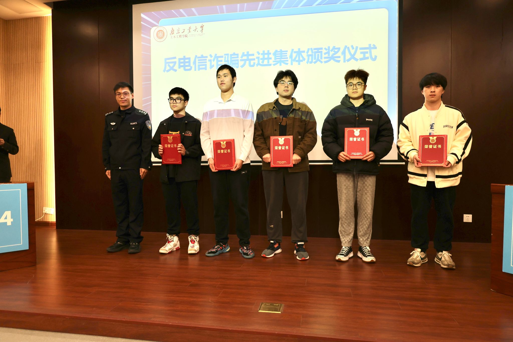 比赛开始前,徐东副部长宣读学院2023年度反电信诈骗先进集体表彰名单,张峰林警官为获奖集体颁奖,随后班级反诈宣传员代表发言,介绍班级反诈工作开展经验。竞赛环节共设必答题、抢答题、风险题和主观题四个环节。必答题环节,各参赛队伍稳定发挥,冷静作答;抢答题环节紧张激烈,展现了选手们果断敏锐的风采;风险题和主观题环节则比出了选手稳健的临场应变能力和扎实的反诈知识储备。现场还设置了有奖问答互动环节,观众们积极参与,赛场气氛热烈。经过激烈角逐,土木2306班获一等奖,张涛书记、徐东副部长和张峰林警官为所有获奖班级颁发荣誉证书。
