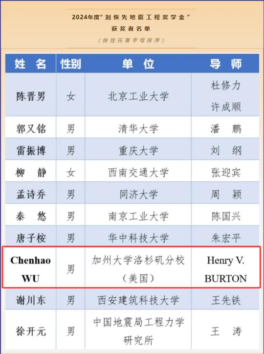 我院2019届校友乌忱昊荣获2024年度“刘恢先地震工程奖学金”