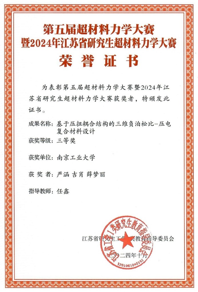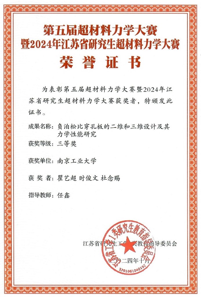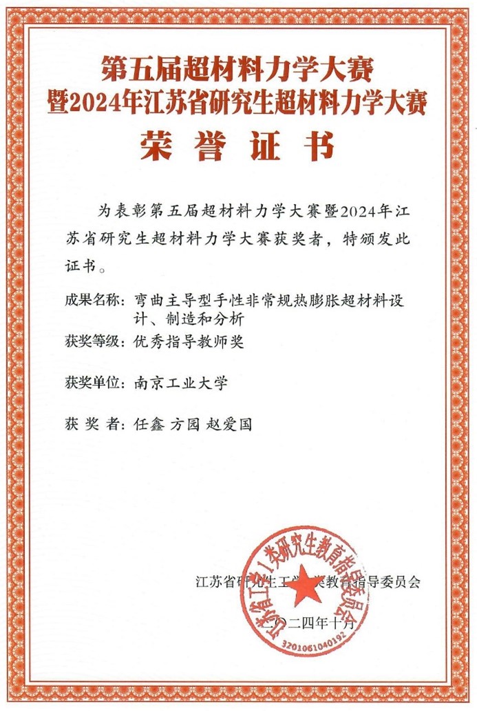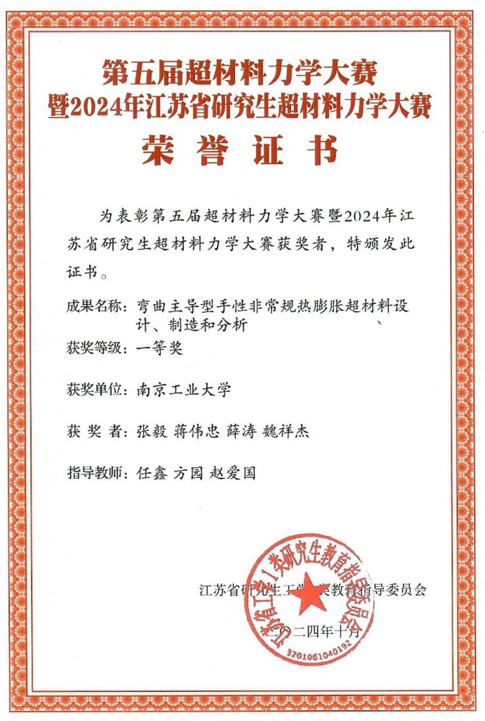 20241027日,第五届超材料大赛力学大赛暨2024年江苏省研究生超材料力学大赛总决赛在江苏南京顺利举行。经过初赛筛选,共有来自大连理工大学、哈尔滨工业大学、国防科技大学、同济大学、西北工业大学等22所高校团队,35组作品参加大赛决赛答辩。我院学子获得全国一等奖1项(决赛成绩前五名)、三等奖2项,指导老师任鑫教授、方园副研究员和赵爱国教授荣获大赛优秀指导教师称号。