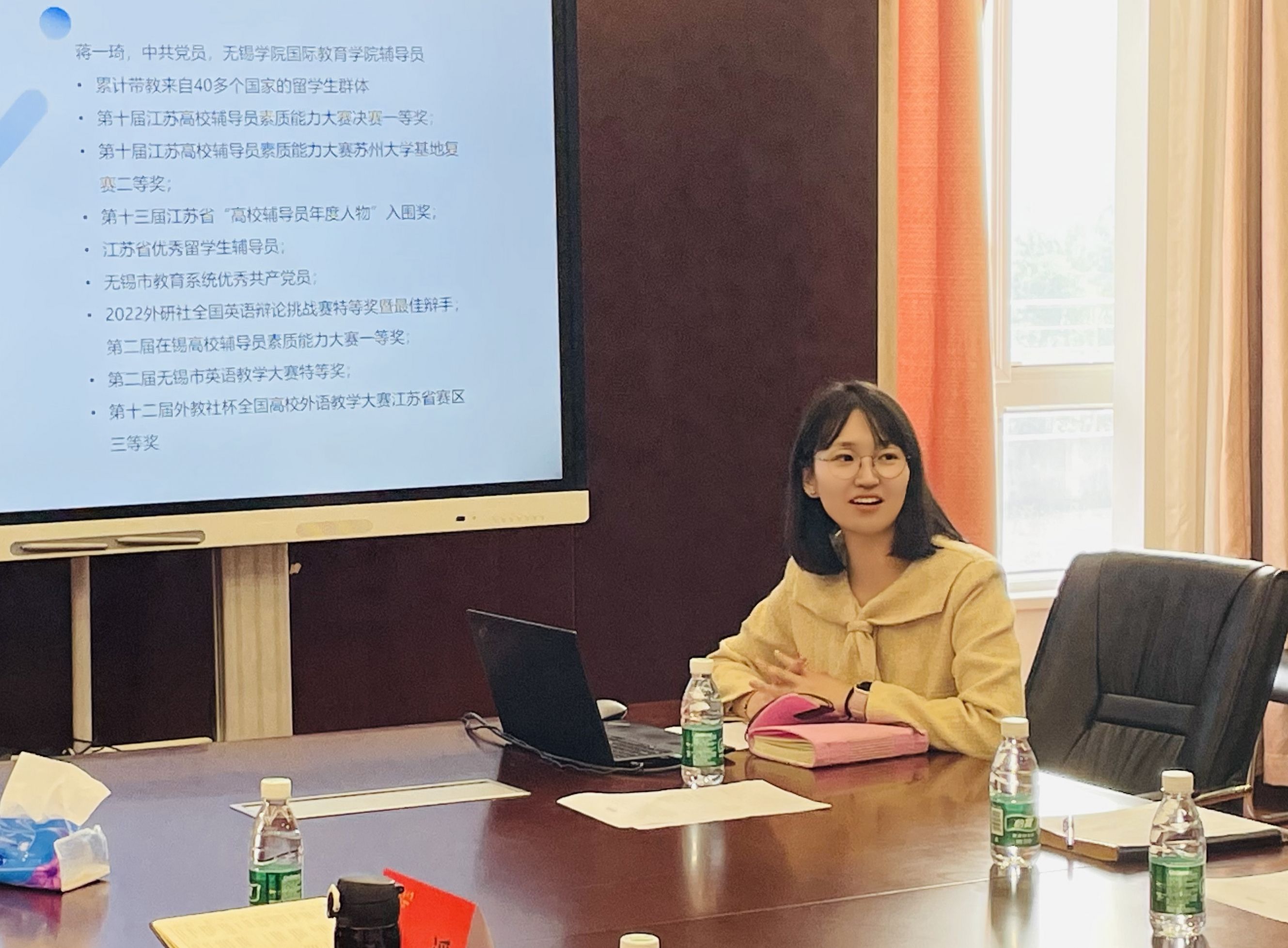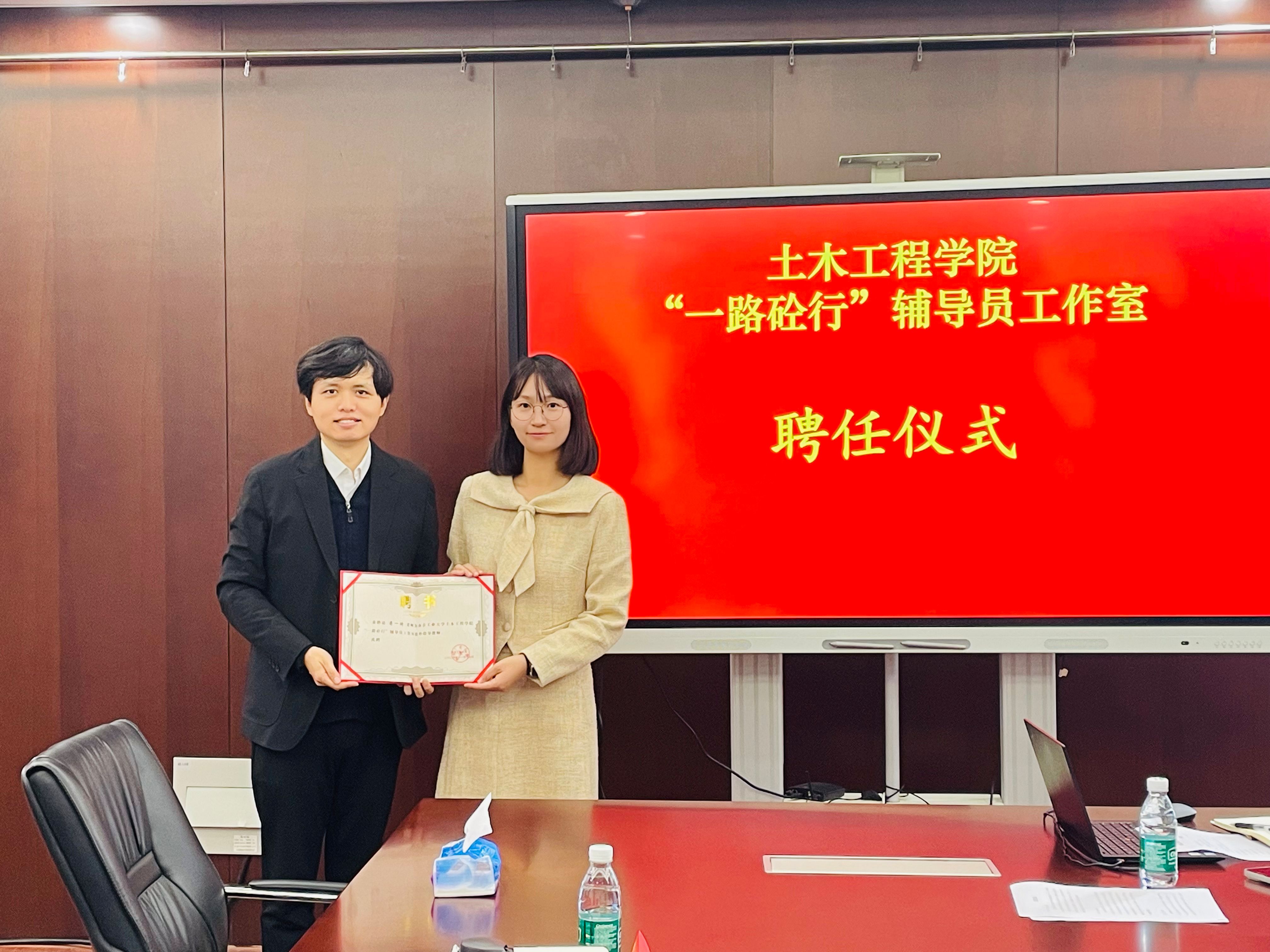 蒋一琦老师以《育己带动育人》为题,结合自身参赛经历,从赛程简介、主要题型、答题技巧和备赛心得四个方面就如何备战辅导员素质能力大赛进行了分享,重点介绍了案例分析和谈心谈话两个题型的答题要点和备赛关键。蒋老师还结合日常教育管理工作中的生动案例讲述了自身在育人、育己方面的所思所感。随后,蒋一琦老师和学院辅导员老师进行了谈心谈话和案例分析真题实战演练,并就大学生思想政治教育、党团工作等辅导员日常工作做了交流和探讨。分享会开始前,院党委副书记路遥为蒋一琦老师颁发学院“一路砼行”辅导员工作室校外导师聘书。