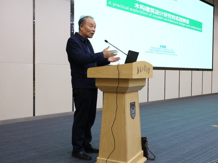 中国工程院院士、东南大学王建国教授作题为木构建筑设计研究和实践探索的主旨报告,王院士在报告中指出木结构是绿色低碳、实现可持续发展的重要途径,并详细介绍了第十三届徐州园林博览会、第十届扬州园艺博览会等多个木结构主展馆的设计与建造,这些建筑体现了华夏意匠和传统绿色智慧,为木结构建筑工业化的发展奠定了基础。