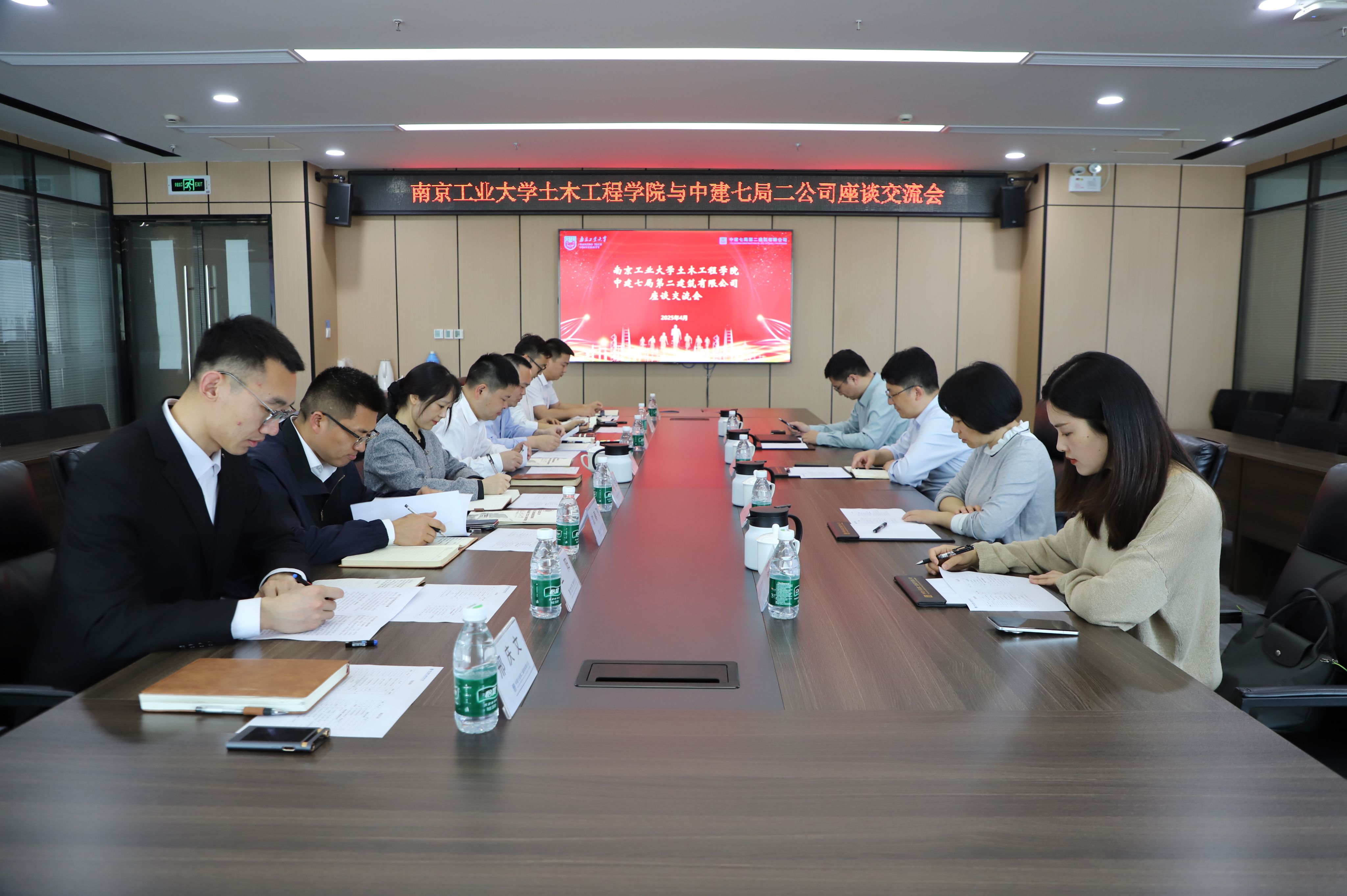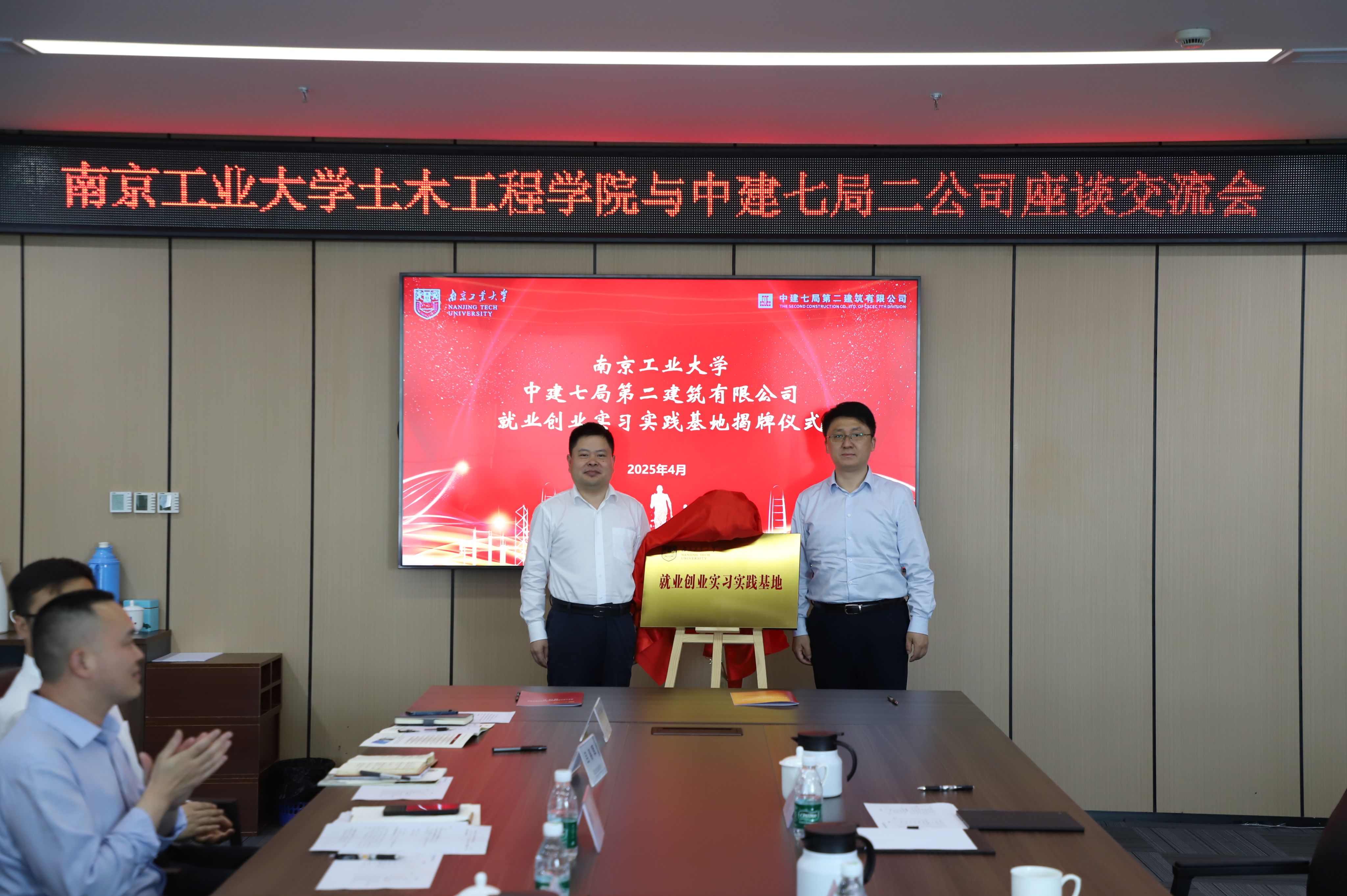 产教融合拓岗位:精准对接企业人才需求。方海院长一行还赴中建七局二公司开展校企协同调研交流。公司领导万书胜、公司总部相关部门参加座谈。双方共同观看校、企宣传片,围绕人才队伍建设情况、公司科技创新业务情况及中建七局城市排水管网系统化治理探索等领域展开技术交流,并基于近三年毕业生成长数据,分析行业对复合型人才的能力需求,南工大2012届本科毕业生沈春飞、2023届硕士毕业生王阳作为优秀毕业生代表发言。现场举行的“就业创业实习实践基地”揭牌、签约仪式,标志着双方合作进入新阶段。