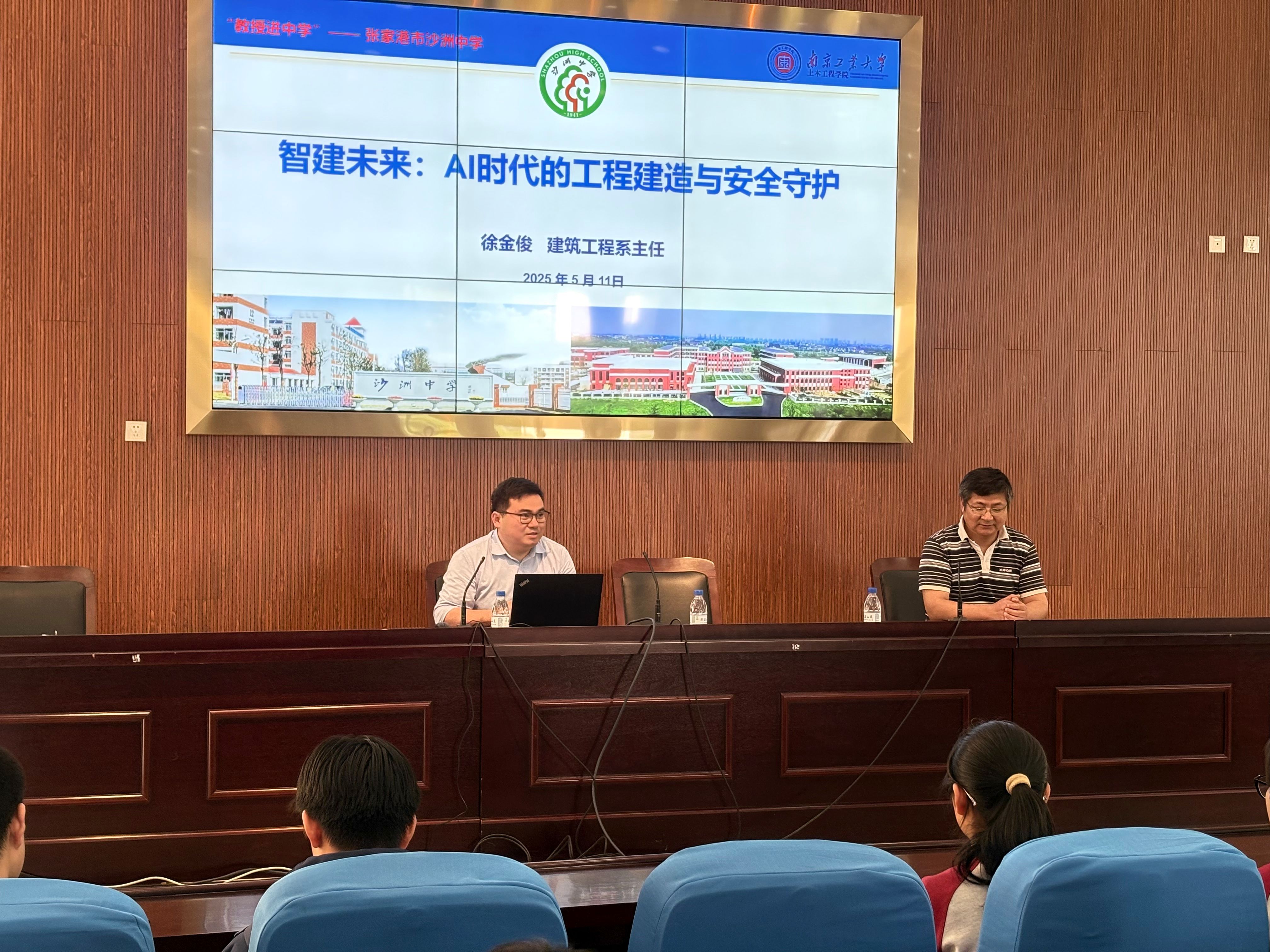 5月11日,999论坛白菜大全赴张家港沙洲中学开展“教授进中学”活动。999论坛白菜大全建筑工程系党支部书记、系主任徐金俊老师、辅导员谢雅文、沙洲中学200余名高中生参加本次活动。