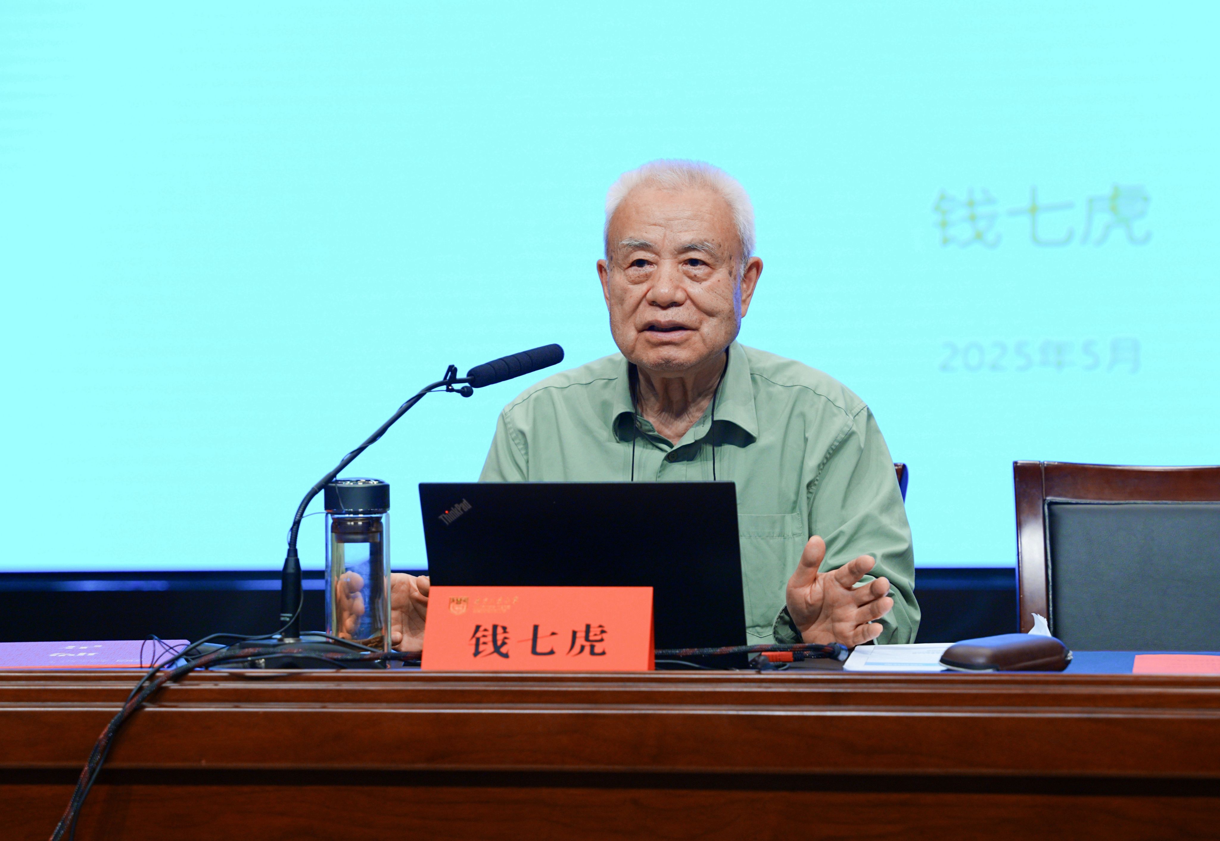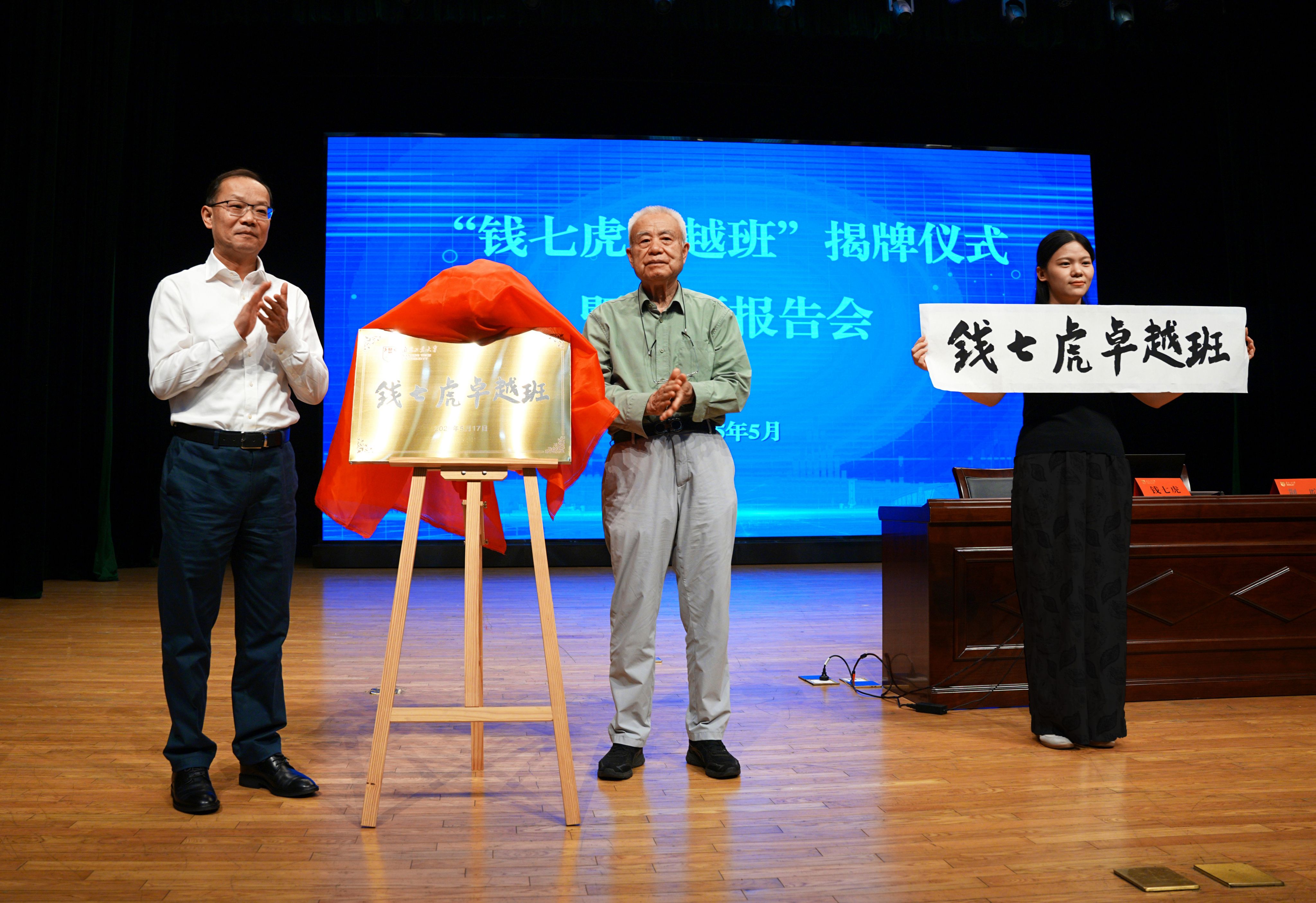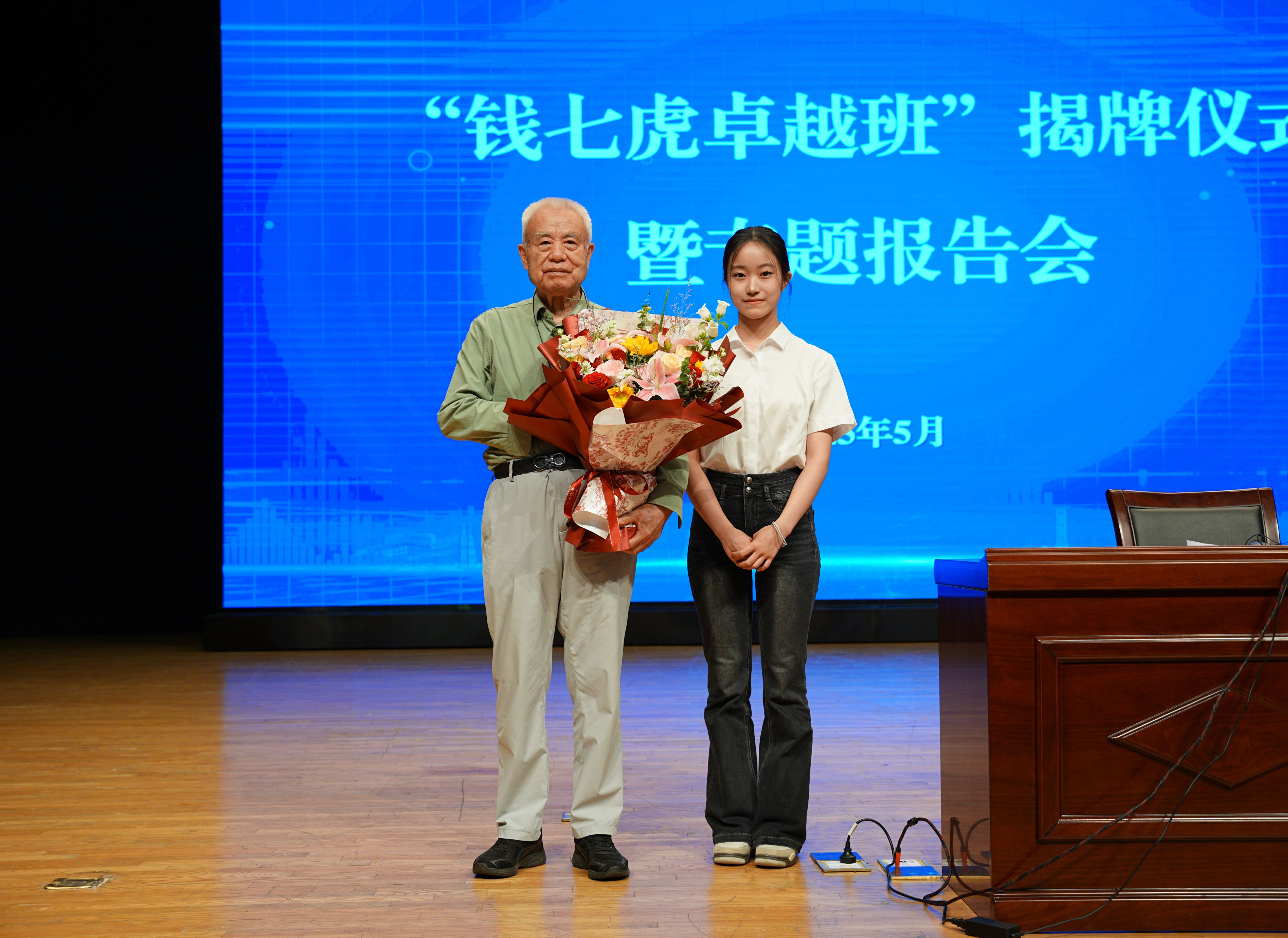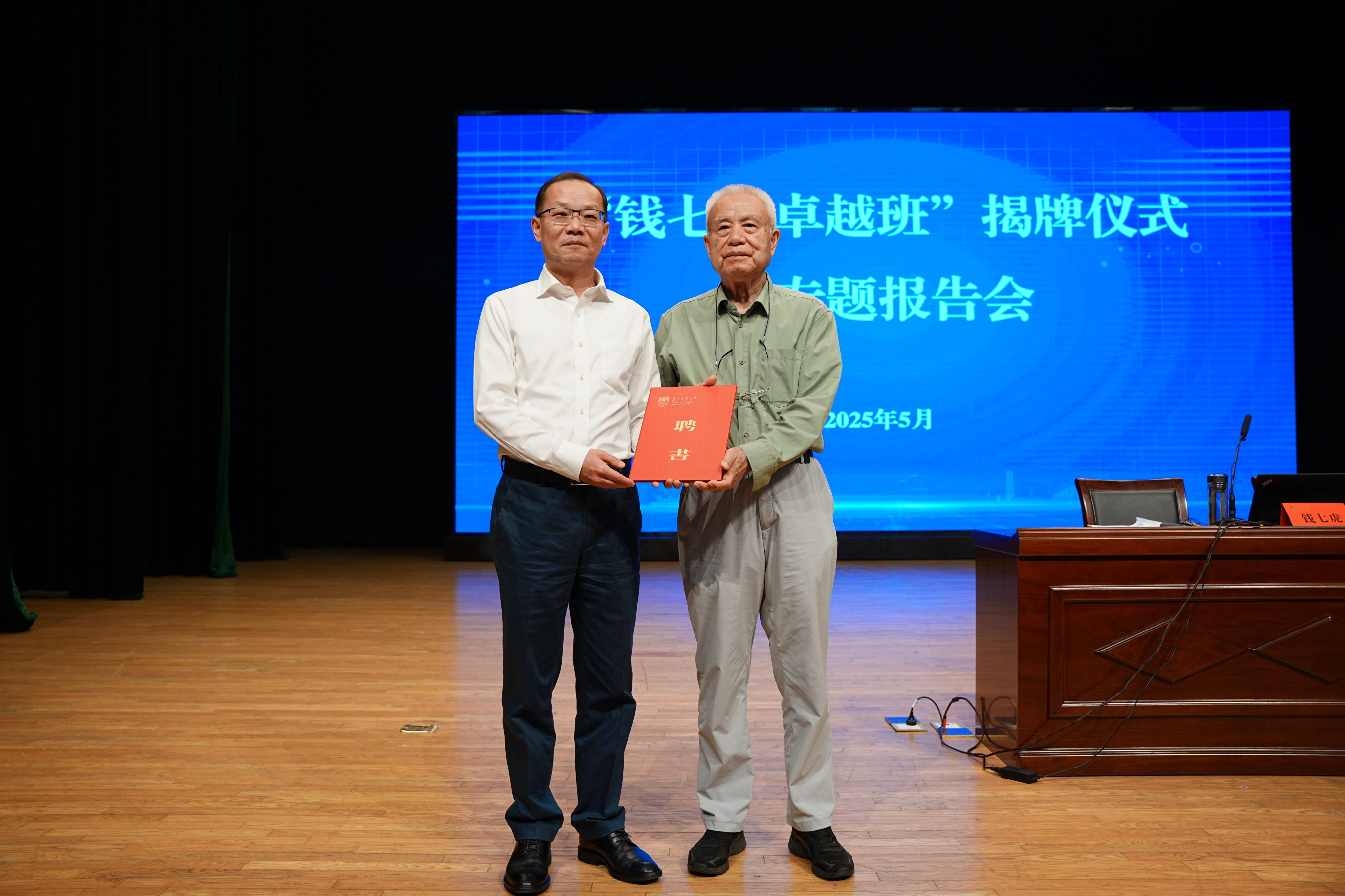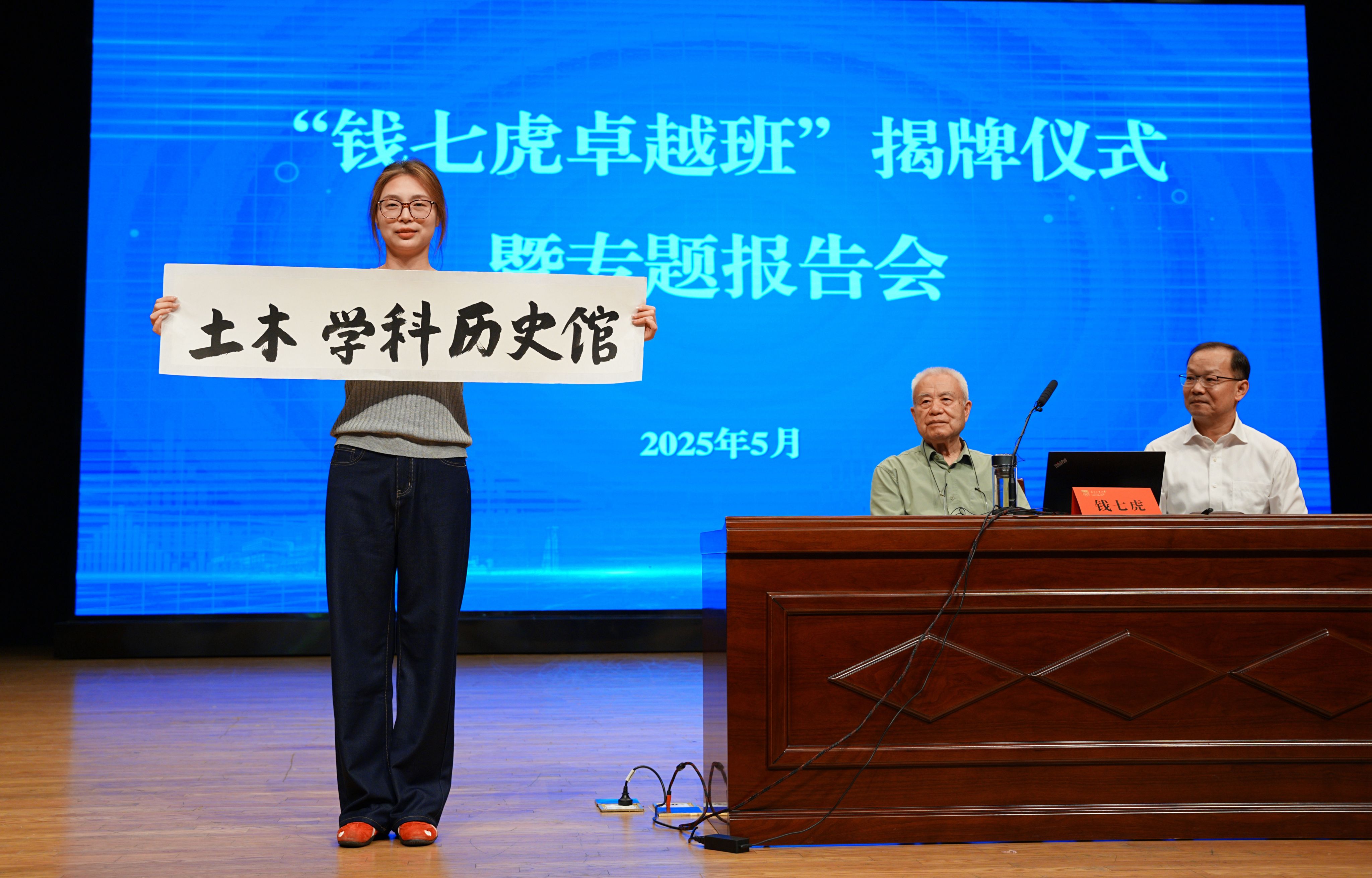 陆伟东副校长介绍了钱七虎院士简历。钱七虎院士与荆晅书记共同为“钱七虎卓越班”揭牌;荆晅书记为钱七虎院士颁发“荣誉班主任”证书,现场展示了钱七虎院士亲笔题写的“钱七虎卓越班”、“土木学科历史馆”。现场学生为钱院士献花。钱七虎院士作《土木工程学科的伟大、飞跃和转型》专题报告。解答了为什么土木工程是一个伟大学科,为什么是一个走向科学前沿的学科,为什么中国式现代化离不开土木工程的支撑这三个问题,回顾了砖瓦、钢材、混凝土引领的土木工程前三次飞跃,分析了土木工程学科转型的必要性和可行性,展望了插上数字化翅膀的土木工程第四次飞跃。全国工程勘察设计大师、中交公路规划设计院有限公司副总经理王仁贵作《张靖皋长江大桥结构体系及关键部件创新》报告,以张靖皋长江大桥的设计与施工为案例,在结构受力更为合理的前提下,运用BIM智能化技术实现了张靖皋大桥主跨突破2000 米大关,体现工程学科向“绿色低碳、智能建造”方向转型的迫切性与必然性。清华大学土木工程系主任冯鹏作《面向未来的土木工程——更智能、更宽广》报告,传统的人才培养模式已不适用,必须要改革。未来的土木工程将更智能、更宽广,未来的土木工程师需要突破思维边界、知识边界和体验边界。