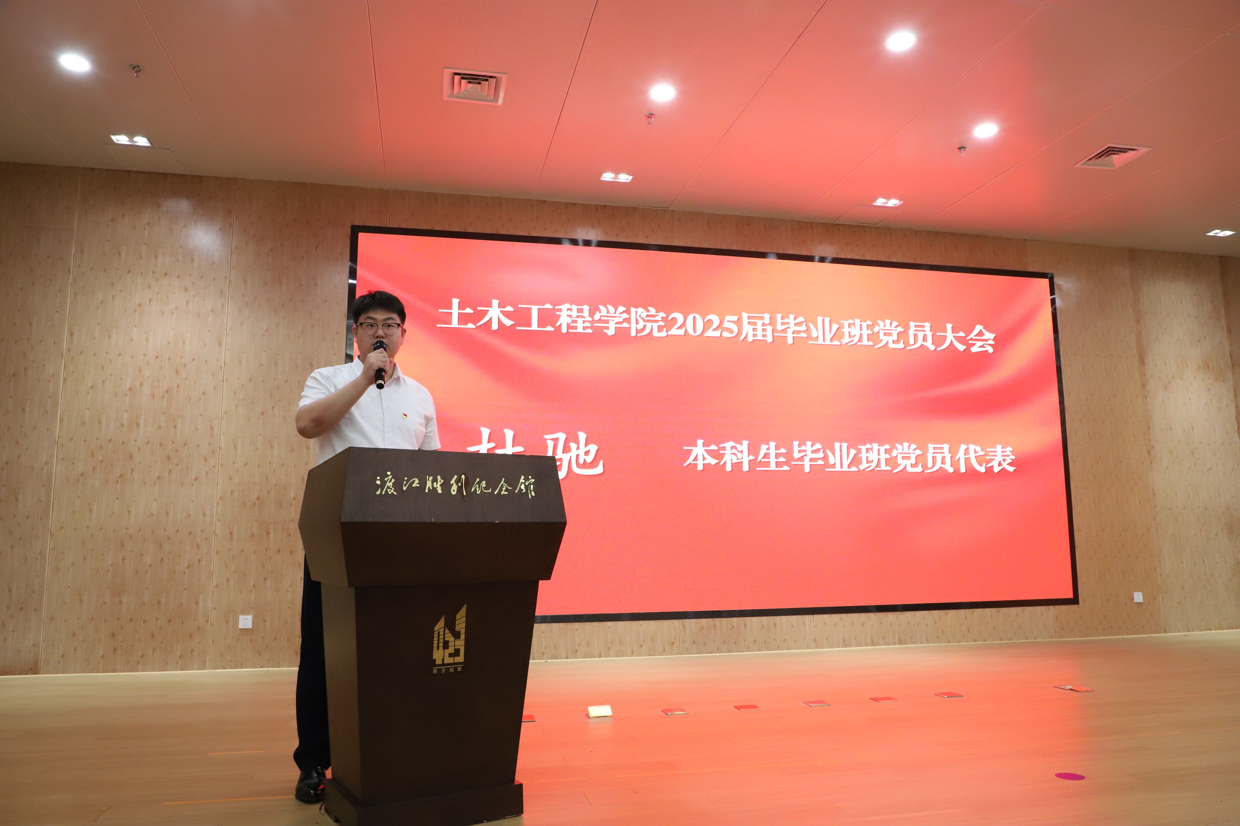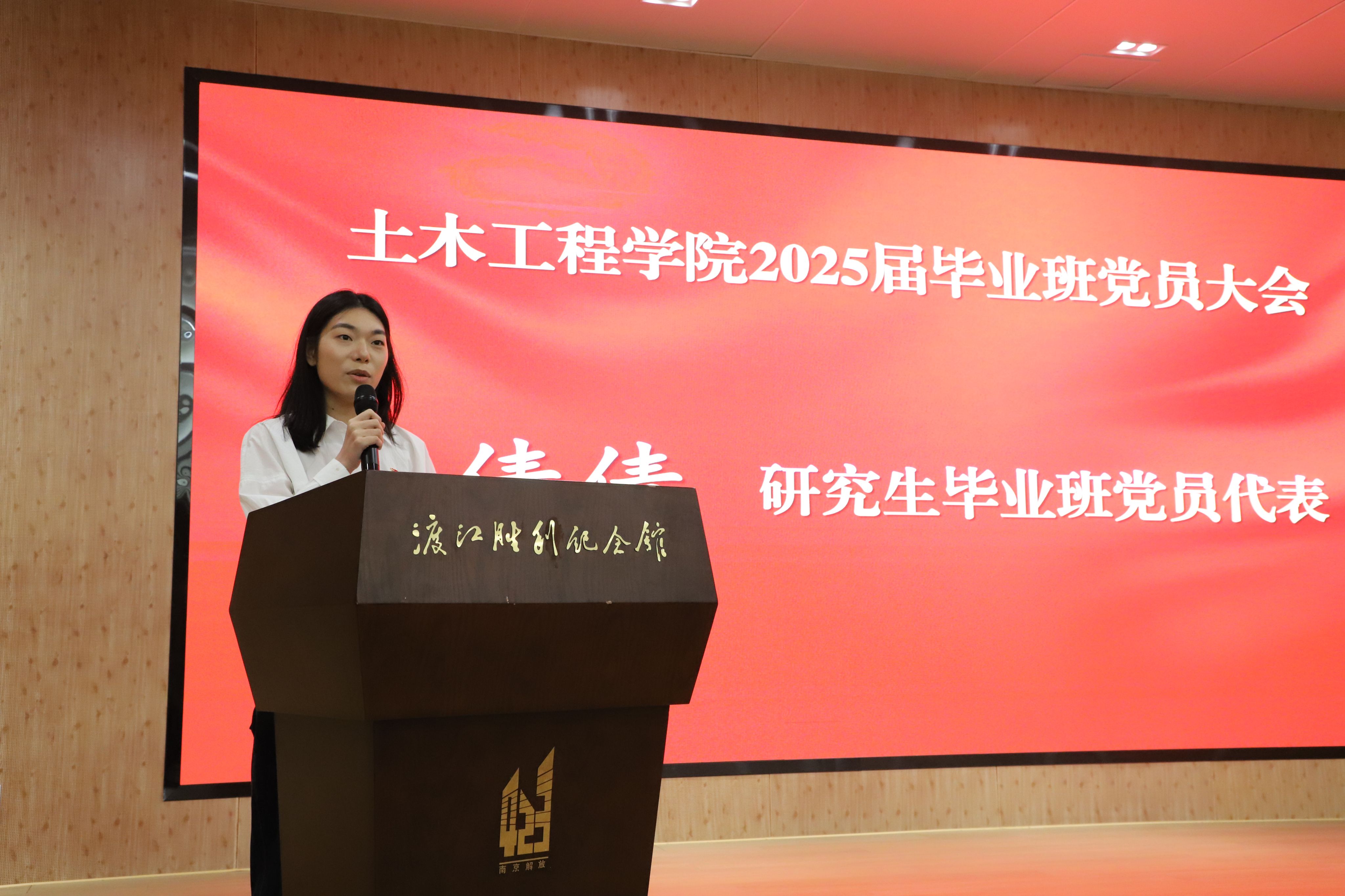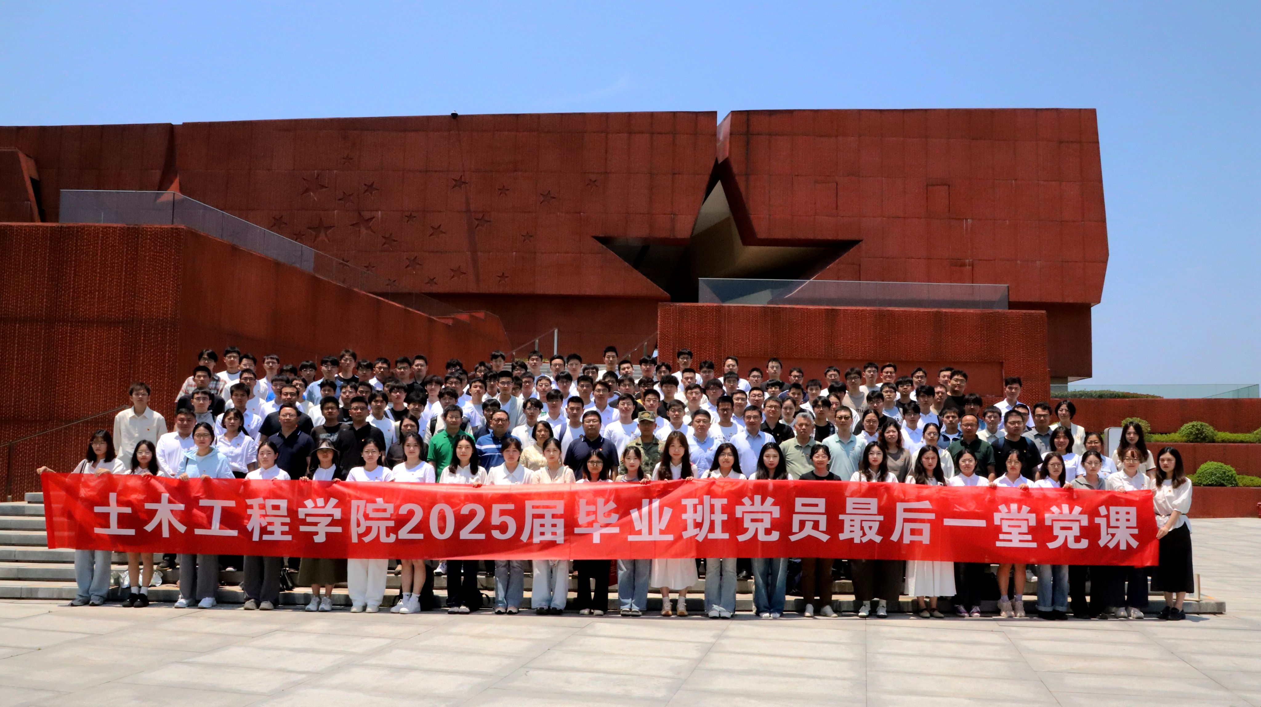 本科生党员杜驰、研究生党员黄倩倩作为毕业生党员代表发言。他们回顾了在校期间的成长历程,感谢党组织培养与师长教诲,承诺将牢记“明德厚学、沉毅笃行”的校训,在工程一线、社会基层中持续践行初心使命。院长方海在寄语中提出三点期望:一是以信仰为基,赓续红色血脉;二是以传承为脉,厚植家国情怀;三是以担当为魂,勇立时代潮头。活动最后,全体党员在纪念馆前合影留念。