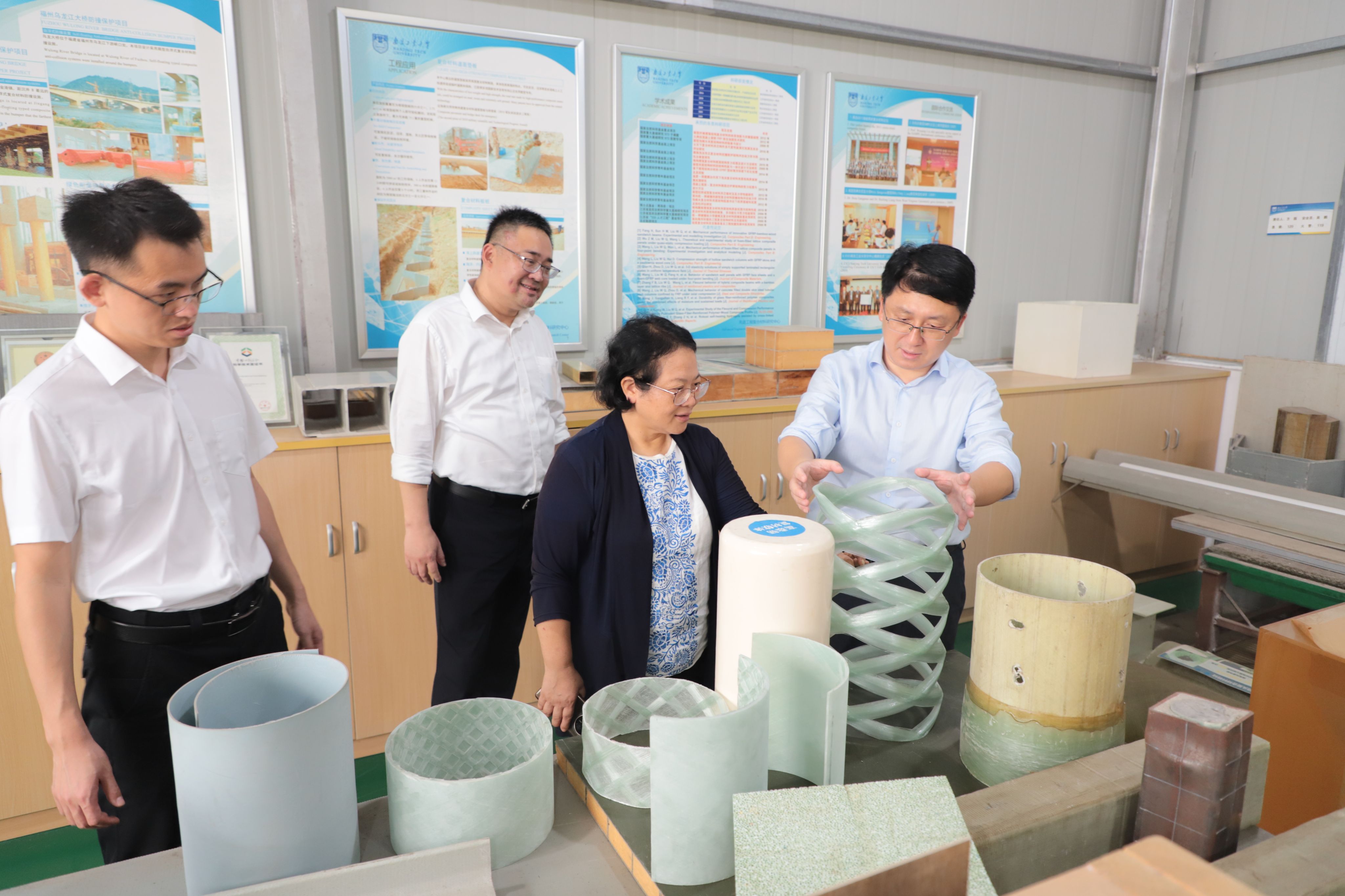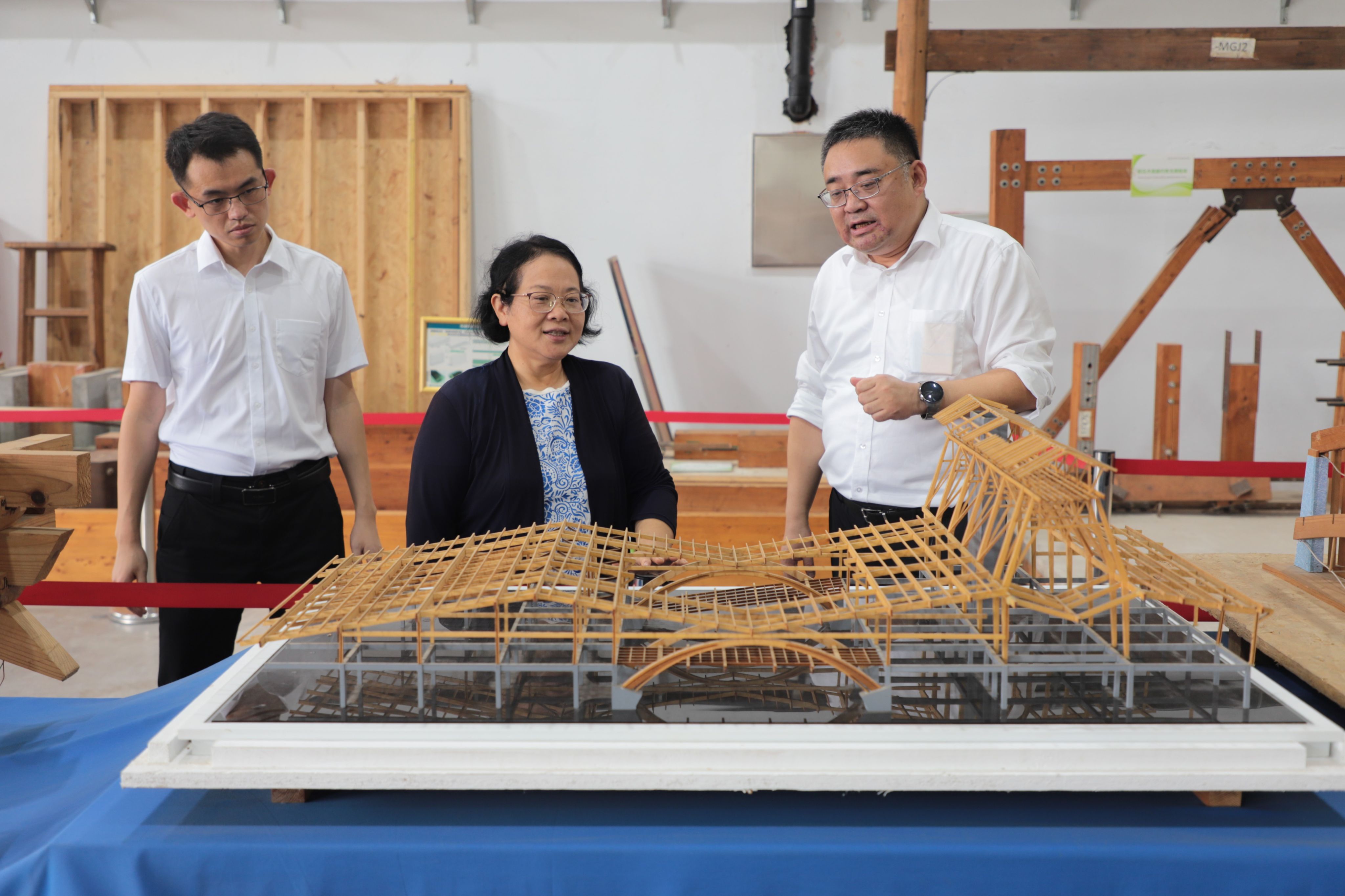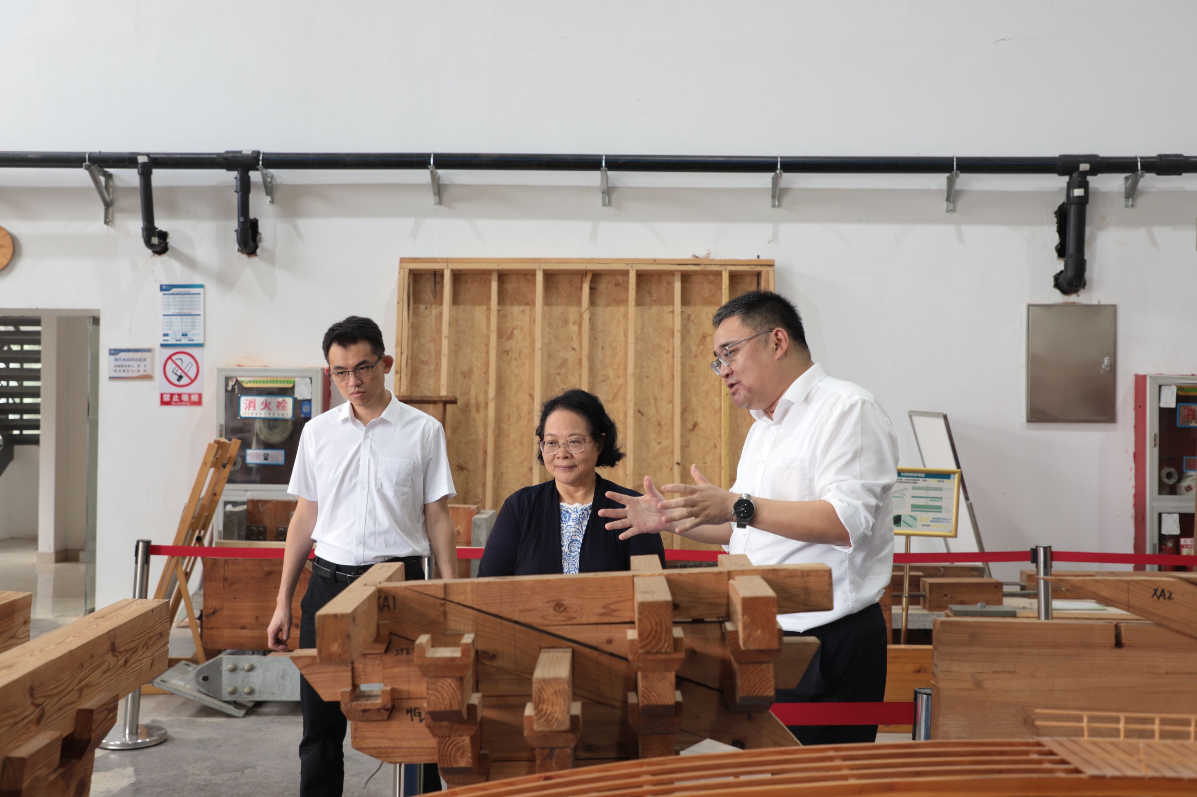 在副校长陆伟东、院长方海的陪同下,陈新司长一行参观了999论坛白菜大全现代木结构实验室、复合材料结构实验室、结构综合实验室等。