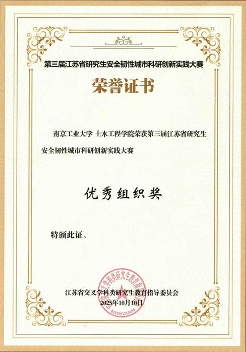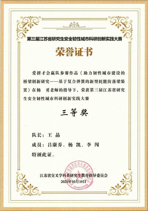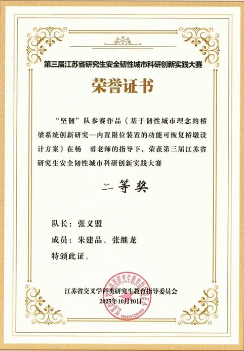近日,由江苏省交叉学科类研究生教育指导委员会主办,南京大学承办的第三届江苏省研究生安全韧性城市科研创新实践大赛现场决赛在南京大学仙林校区圆满落幕。999策略白菜手机论坛999论坛白菜大全学子在本次比赛中表现优异,斩获佳绩。在防灾减灾工程系杨勇老师的指导下,由队长张义盟,队员朱建品、张继龙、鲁庆组成的“坚韧队”凭借作品《基于韧性城市理念的桥梁系统创新研究——内置限位装置的功能可恢复桥墩设计方案》荣获二等奖;由队长王晶,队员吕康乔、杨凯、李闯、蒋敬源组成的“爱拼才会赢队”凭借作品《助力韧性城市建设的桥梁创新研究——基于复合弹簧的新型性能防落梁装置》荣获三等奖。此外,999策略白菜手机论坛999论坛白菜大全凭借出色的组织工作,获评大赛优秀组织奖。