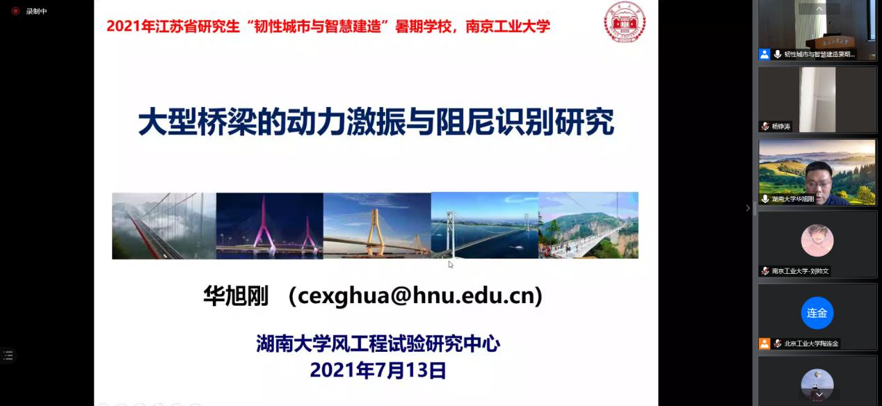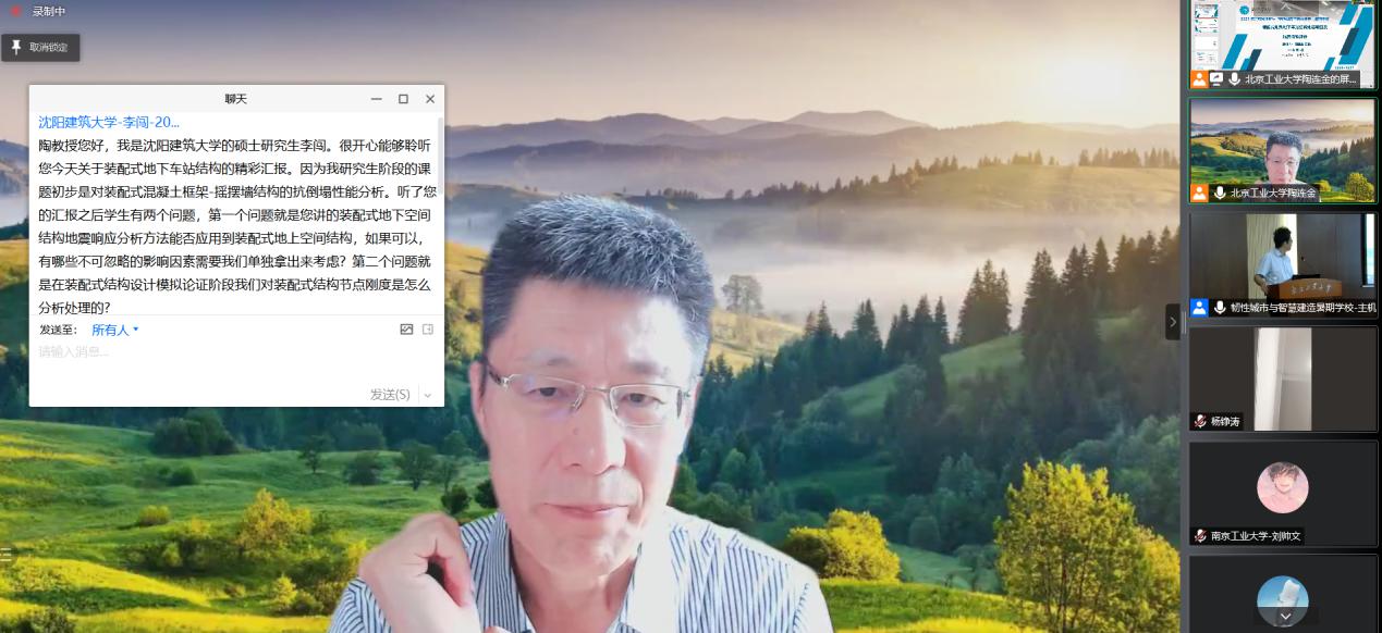 讲座9:00开始,北京工业大学的陶连金教授8:00就已经进入了腾讯会议直播平台为奉献精彩的讲座做准备。陶教授为大家带来的是“装配式地铁地下车站结构地震响应及抗震性能评价”,从轨道交通建设面临的对周边环境影响大、现浇工序复杂、施工效率低等问题引入装配式建筑,指出装配式施工工艺具有施工速度快、建造质量高、项目成本低、可持续发展及安全性高的优点,接下来介绍了装配式车站的施工方案、连接接头形式及试验与数值计算研究、装配式地铁地下车站在长春和深圳的工程实例、装配式车站的防水系统、隧道结构在地震作用下的破坏形式及地下结构的抗震分析方法等内容。陶教授耐心、细致的讲解让同学们很快了解了装配式地下车站技术,同学们提问积极,待报告结束时仍感意犹未尽。接下来,来自湖南大学的国家杰青获得者华旭刚教授给学员们带来了“大型桥梁的动力激振与阻尼识别研究”的讲座,报告指出阻尼特性是评价结构动力性能的重要参数,并介绍了自研发的模态全参数识别方法、按模态周期连续跳车的桥梁动力激振技术以及悬索桥涡振的直接阻尼减振系统。华院长结合洞庭湖悬索桥、港珠澳大桥多跨连续梁桥的工程案例进行讲解,吸引了同学们的极大兴趣,同学们也就桥梁动力作用下的安全性、涉及振动的车桥耦合等问题与华院长进行了交流。