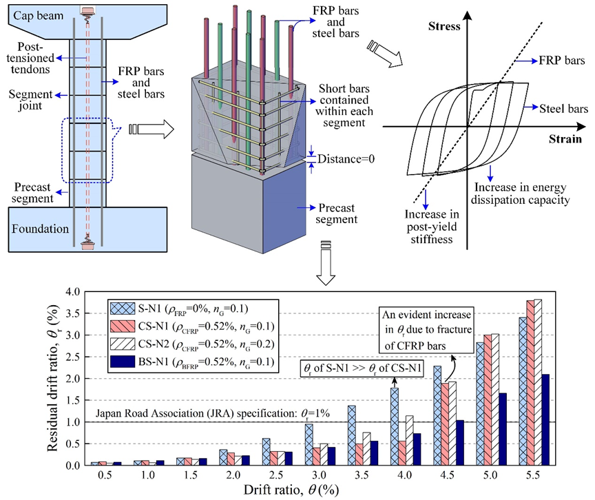 该文创新性地提出了混合配筋节段预制拼装桥墩设计理念,并通过拟静力试验和理论分析研究了该新型构件的合理地震失效模式及基于抗震韧性的损伤极限状态。研究结果表明:(1)以轻质高强的FRP筋与普通热轧带肋钢筋作为混合配筋,可使墩柱屈服后刚度提高达93%,从而减小地震反应离散性及大震下墩顶位移反应;(2)混合配筋方案可使墩柱残余位移减小达68%,显著提高了自复位能力和震后可修复性。该研究论文为解决结构构件自复位能力与耗能能力难以兼顾的科学难题提供了新的有效思路。