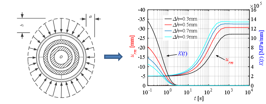 Abstract: An analytical solution is presented for an infinite multilayer pipe bonded by viscoelastic interlayer subjected to racial loads non-uniformly distributed along the circumferential direction in order to investigate its time-dependent behavior. The elasticity equations in the polar coordinate are used to describe the stresses and displacements in each pipe layer. The viscoelastic property of the interlayer is modeled by the standard linear solid model considering the strain memory effect. By means of the Fourier series expansion method, the general solution of stresses and displacements is derived out with unknown coefficients, which are further determined by using the analytical Laplace transformation method. The present solution obtained can be used as the benchmark to validate other solutions such as finite element solution for the same problem. The comparison study shows a trend of the finite element solution converging to the present one as the mesh becomes refined; however, such a finite element model is time-consuming. The influences of load distribution, geometry and material parameters on the time-dependent stress and displacement fields in the pipe are discussed detailedly.