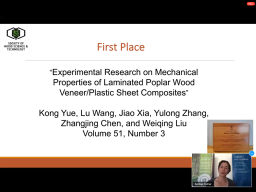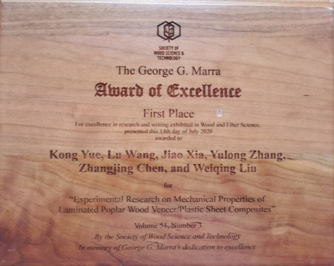 999策略白菜手机论坛木结构学术团队岳孔教授课题组在江苏省建筑产业现代化专项引导资金科技支撑项目资助下,研发了“零危害”木基结构板材新产品(结构用木塑层合板),相关成果以题为“Experimental research on mechanical properties of laminated poplar wood veneer/plastic sheet composites”发表在SCI检索期刊Wood and Fiber Science (2019, 51(3): 320-331)中,该论文被评为2020年度International Society of Wood Science and Technology (SWST, 国际木材科学技术学会) George Marra Award论文一等奖。