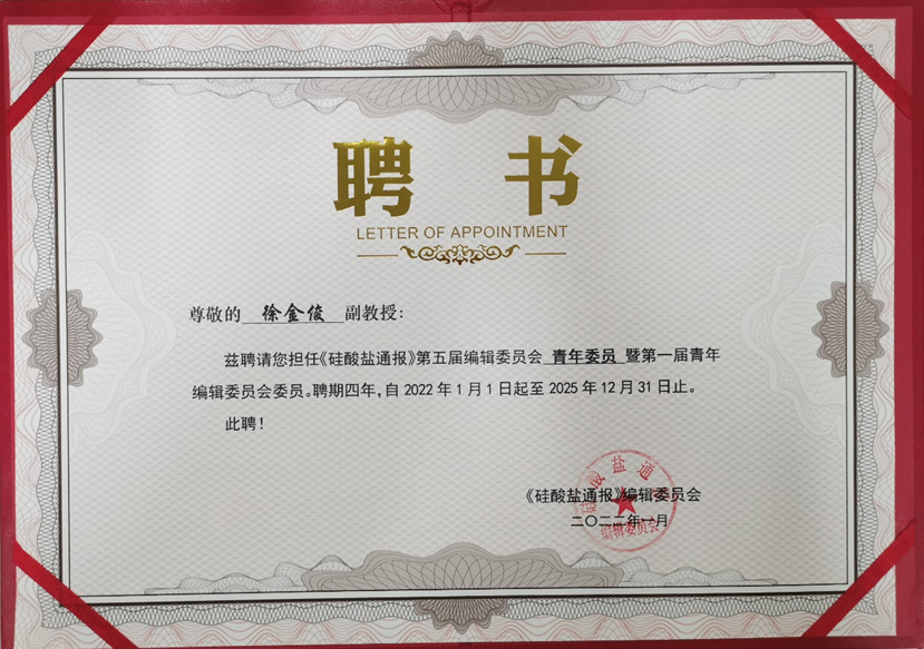 近期,我院徐金俊副教授收到来自《硅酸盐通报》编辑部的聘任邀请,担任该刊第五届编辑委员会青年委员暨第一届青年编辑委员会委员,聘期四年,自2022年1月1日起至2025年12月31日。据悉,青年编委的职责不仅仅是协助期刊编辑部处理同行稿件的工作事宜,而且更为重要的是需根据他们自身的影响力积极推动期刊的宣传与学科的发展,其为编委及资深编委的后备力量。