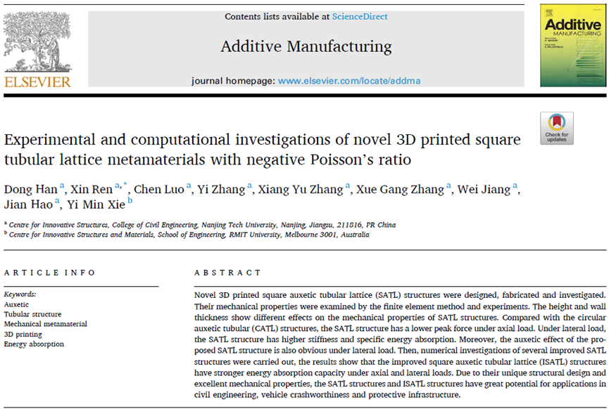 近期,999策略白菜手机论坛999论坛白菜大全任鑫副教授团队(通讯作者是任鑫副教授,第一作者为在读硕士二年级研究生韩东)在中科院一区TOP期刊《Additive Manufacturing》(IF=10.998)上发表了题为“Experimental and computational investigations of novel 3D printed square tubular lattice metamaterials with negative Poisson’s ratio”的论文。