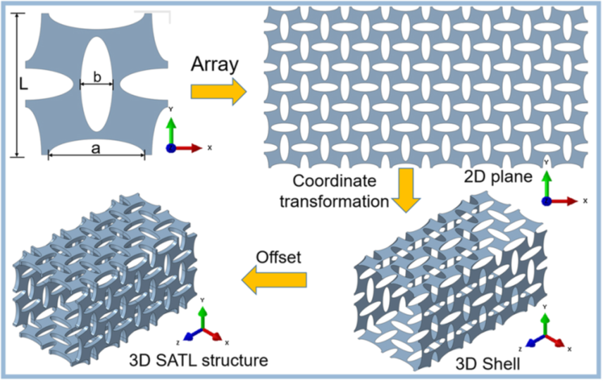 本文针对负泊松比管状晶格超材料的研究仅仅停留在圆形截面上的现状,设计、制备并研究了首个新型的方形截面负泊松比金属晶格管状超材料,此项研究工作也为提升负泊松比晶格管状超材料的侧向刚度提供了新的思路。该项工作的成功实施,进一步拓展了负泊松比超材料的结构形式,有利于推动力学超材料的快速发展。