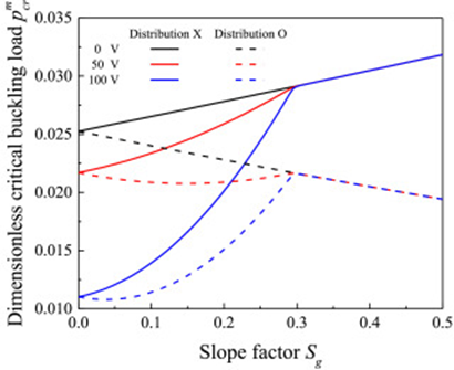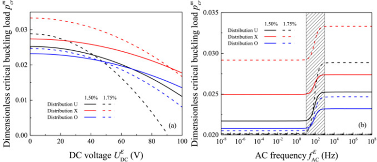 基于此背景,冯闯教授团队采用有效介质理论(Effective Medium Theory, EMT)同时估算了石墨烯增强介电复合材料的力学性能和介电性能,并使用微分求积法(Differential Quadrature Method, DQM)建立了功能梯度石墨烯增强复合材料介电板在电场作用下非线性振动的数值计算模型。通过上述数值计算模型,分析了不同参数对功能梯度石墨烯增强复合材料介电板非线性振动性能的影响。结果表明,调整石墨烯增强复合材料介电板中石墨烯的分布方式、体积含量、材料梯度,调节外加电场的电压和频率,能够显著影响结构的非线性振动响应,为功能梯度石墨烯增强复合材料介电板的设计优化提供了理论参考。
