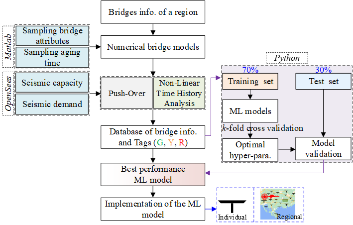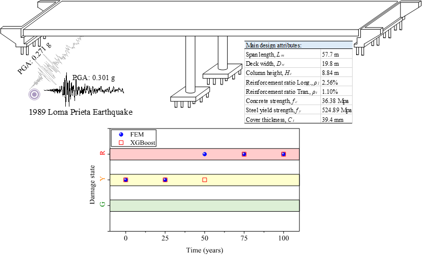 混凝土桥梁群/网的震后损伤评估对于城市尺度的震前灾害预防、震后赈灾决策等等都具有十分重要的意义。然而城市区域内混凝土桥梁尺度和规模较大,传统的混凝土桥梁损伤评估技术面临着计算量巨大、结果滞后等缺陷。同时,传统方法较难以有效地考虑区域内桥梁老化以及参数更新等影响。针对上述问题,论文提出了一种基于数据驱动的区域混凝土桥梁震后损伤快速评估方法。与既有方法相比,该方法具有以下特色和优势:(1)可快速给出区域大规模桥梁震后损伤等级,无需复杂的数值计算(区域尺度);(2)可有效考虑单体桥梁参数不确定性,有助于准确识别区域内某一危险桥梁(单体尺度);(3)面向全寿命周期,可考虑全服役期内桥梁老化的影响(时间尺度)。相关研究成果可为城市尺度的基础设施灾害预防、韧性提升等提供方法参考。