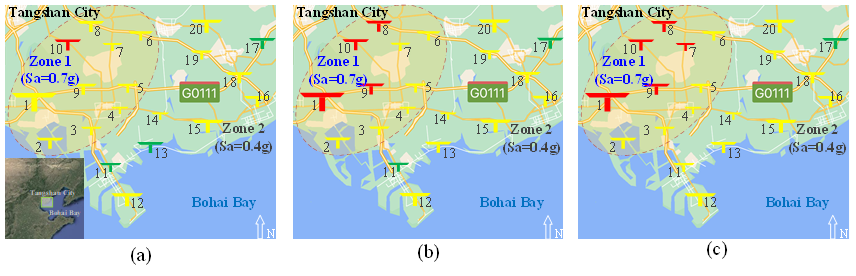 Fig. 3. 区域混凝土桥梁震后损伤评估结果:(a) 0年;(b) 50年;(c) 100年
