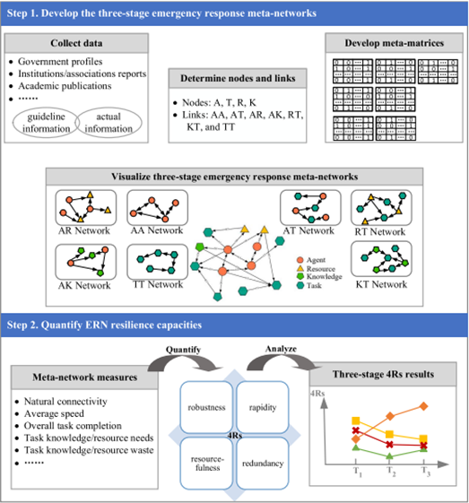 论文摘要:建立具有韧性的应急响应网络(ERNs)对在极端事件中遭受扰动的基础设施能快速恢复至关重要。为提升应急响应网络韧性能力提供关键准则和实施策略,本研究提出了一种基于元网络分析法(MNA)的研究框架来系统量化ERNs的韧性能力。该框架首先应用MNA方法将复杂的应急响应概念化为三个阶段的“代理-任务-资源-知识”四维元网络,以代表利益相关者、响应任务、应急资源和专业知识之间的联系。其次,通过优化相应的元网络指标(即Natural connectivity、Average speed、overall task completion、the integrative metric of task resource and knowledge needs、task resource and knowledge waste)量化ERNs的韧性能力—鲁棒性、快速性、资源性和冗余性。基于此评估框架,以英国曼彻斯特恐怖袭击事件的应急响应流程作为案例展开研究,分析了应急响应网络韧性随时间的动态变化以及案例场景中韧性能力可能的成因。总的来说,这一优化后的元网络研究框架通过系统地概念化ERN复杂结构和动态地量化ERN的韧性能力,加深了对基础设施应急响应表现的理解。从历史灾难中吸取经验教训为决策者提供了可实施的支持,以帮助他们共享知识、优化资源和完成任务,从而在未来的基础设施运营和应急响应活动中增强韧性能力。