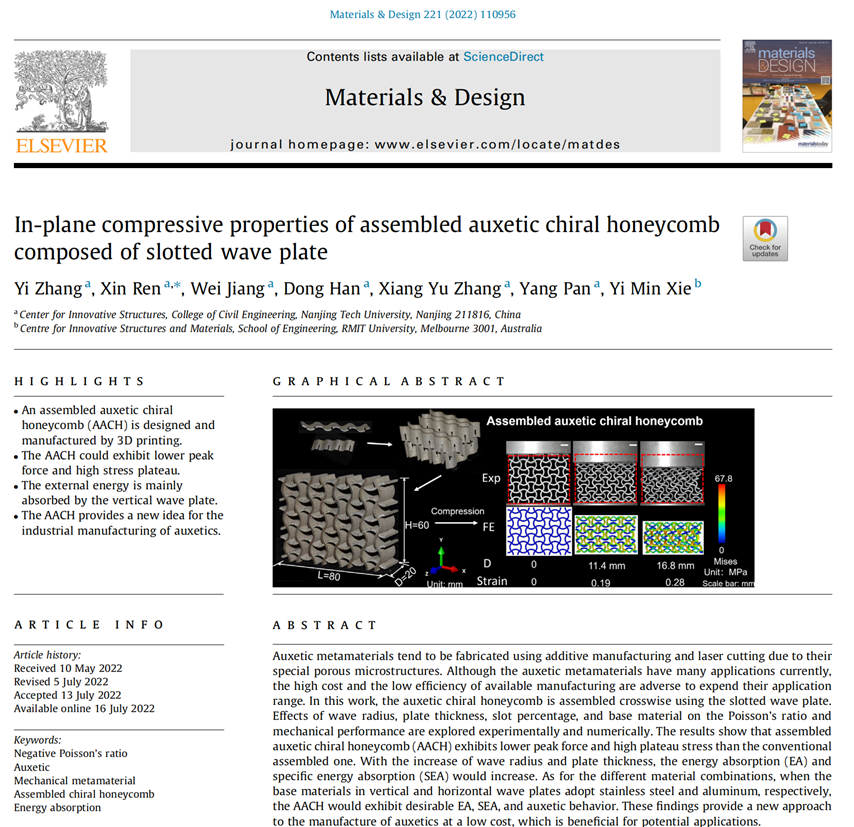 近期,任鑫老师课题组在中科院一区Top期刊《Materials & Design》(IF=9.417)发表了题为“In-plane compressive properties of assembled auxetic chiral honeycomb composed of slotted wave plate”的研究论文。