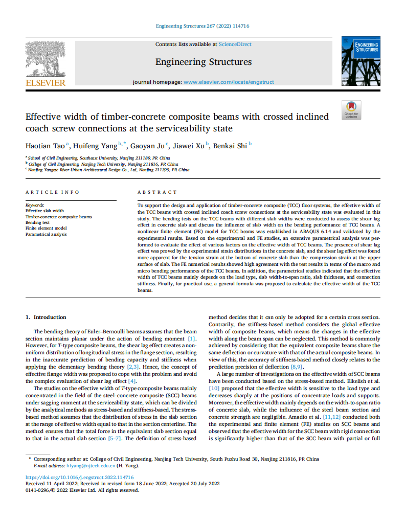 999策略白菜手机论坛999论坛白菜大全杨会峰教授以通讯作者在中科院二区期刊《Engineering Structures》连续发表题为 “Experimental and finite element studies of prefabricated timber-concrete composite structures with glued perforated steel plate connections”、“Effective width of timber-concrete composite beams with crossed inclined coach screw connections at the serviceability state”和“Parameter identification of ductile timber beam-to-steel column connections: Procedure and assessment”的3篇研究论文。前两篇论文的第一作者为陶昊天博士,第三篇论文的第一作者为刘继伟博士,两位博士生目前均就读于东南大学。