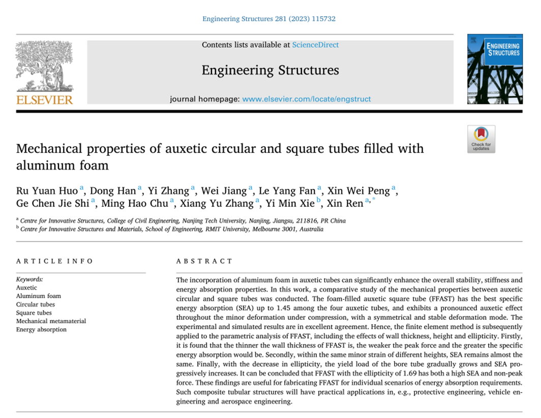 近日,我院任鑫教授团队在JCR -Q1区、中科院二区TOP期刊《Engineering Structures》(IF=5.582)上发表了题为“Mechanical properties of auxetic circular and square tubes filled with aluminum foam”的研究论文。第一作者为我院土木1908班本科生霍如元同学,任鑫老师为独立通讯作者,我院为第一完成单位和通讯作者单位。