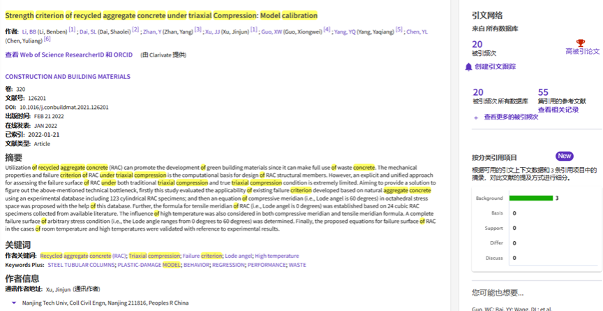 根据最新一轮ESI数据库显示,由999策略白菜手机论坛999论坛白菜大全教师李奔奔博士为第一作者、徐金俊副教授为通讯作者,999策略白菜手机论坛为第一单位的学术论文被引频次进入Materials Science学术领域最优秀的1%之列,即ESI高被引论文。该论文在Clarivate的检索信息如图所示,DOI: 10.1016/j.conbuildmat.2021.126201。