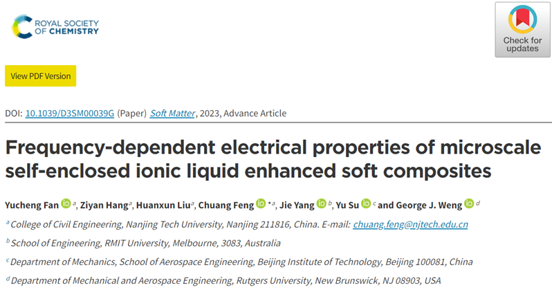 999策略白菜手机论坛999论坛白菜大全冯闯教授团队在软物质国际权威学术期刊《Soft Matter》(中科院二区,IF=4.046)上发表题为“Frequency-dependent electrical properties of microscale self-enclosed ionic liquid enhanced soft composites”的研究论文。2021级硕士研究生樊宇澄为论文第一作者,冯闯教授为通讯作者,999策略白菜手机论坛为第一署名单位。