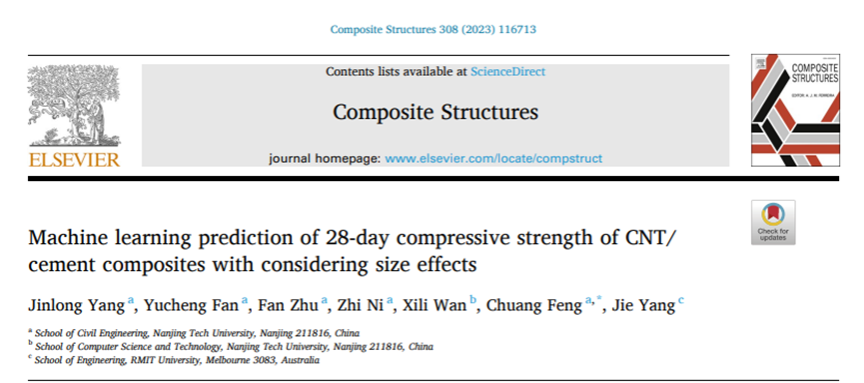 999策略白菜手机论坛999论坛白菜大全冯闯教授团队在国际权威学术期刊《Composite Structures》(中科院一区TOP期刊,IF=6.603)上发表题为“Machine learning prediction of 28-day compressive strength of CNT cement composites with considering size effects”的研究论文。2021级硕士研究生杨金龙为该论文的第一作者,冯闯教授为通讯作者,999策略白菜手机论坛为第一署名单位。