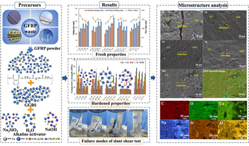 Abstract: The use of waste glass fiber-reinforced polymer (GFRP)powder as a binding agent in the synthesis of geopolymers offers an eco-friendly solution for managing GFRP waste.The aluminosilicate present in GFRP powder can be activated by an alkaline solution to produce a sustainable geopolymer.In this study,a novel rapid repairing material was developed from partially-replaced ground granulated blast furnace slag (GGBS)by GFRP waste powder as precursors in geopolymer mortar(GM).The effect of GFRP powder replacement and mix proportions on the fresh and hardened properties of GMs were evaluated.It was found that an increase in GFRP powder replacement led to an increase in the setting time and a decrease in workability.The highest 28-day compressive strength was obtained at a 20% replacement of GGBS with GFRP powder.At this optimal mixture,the GMs achieved a compressive strength of 15.2 MPa after 6 hours and 35.7 MPa after 1 day.Results from the slant shear test revealed that the failure pattern of the GM-repaired concrete samples changed from interface failure to monolithic failure and explosive spalling in the concrete substrate (CS),when the test duration increased from 3-days to 7-days and 28-days,respectively.This was attributed to the formation of a compact interfacial zone with prolonged testing duration,leading to increased bond strength.The developed GMs demonstrate a short setting time,excellent flowability,high early mechanical strength and superior bond properties,and thus can be applied as rapid concrete repair materials or as protective coatings for concrete in corrosive environments.