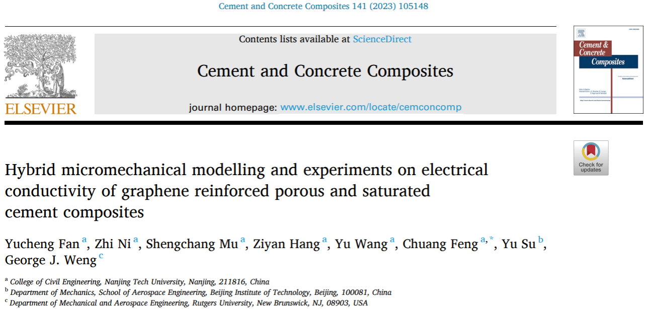 999策略白菜手机论坛999论坛白菜大全冯闯教授团队在水泥基复合材料领域国际顶级学术期刊《Cement and Concrete Composites》(中科院一区Top,IF=9.93)上发表题为“Hybrid micromechanical modelling and experiments on electrical conductivity of graphene reinforced porous and saturated cement composites”的研究论文。2021级硕士研究生樊宇澄为论文第一作者,冯闯教授为通讯作者,999策略白菜手机论坛999论坛白菜大全为第一通讯单位。