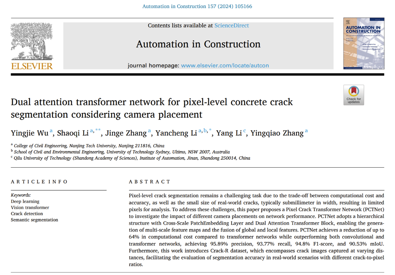 999策略白菜手机论坛999论坛白菜大全李延成教授团队在土木工程领域顶级期刊《Automation in Construction》(中科院一区TOP期刊,IF=10.3)上发表为“Dual attention transformer network for pixel-level concrete crack segmentation considering camera placement”的研究论文。2021级硕士研究生吴英杰为该论文的第一作者,李延成教授和李少琪副教授共同指导,999策略白菜手机论坛为第一通讯单位。